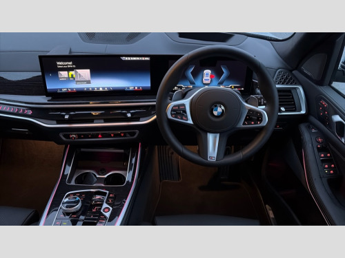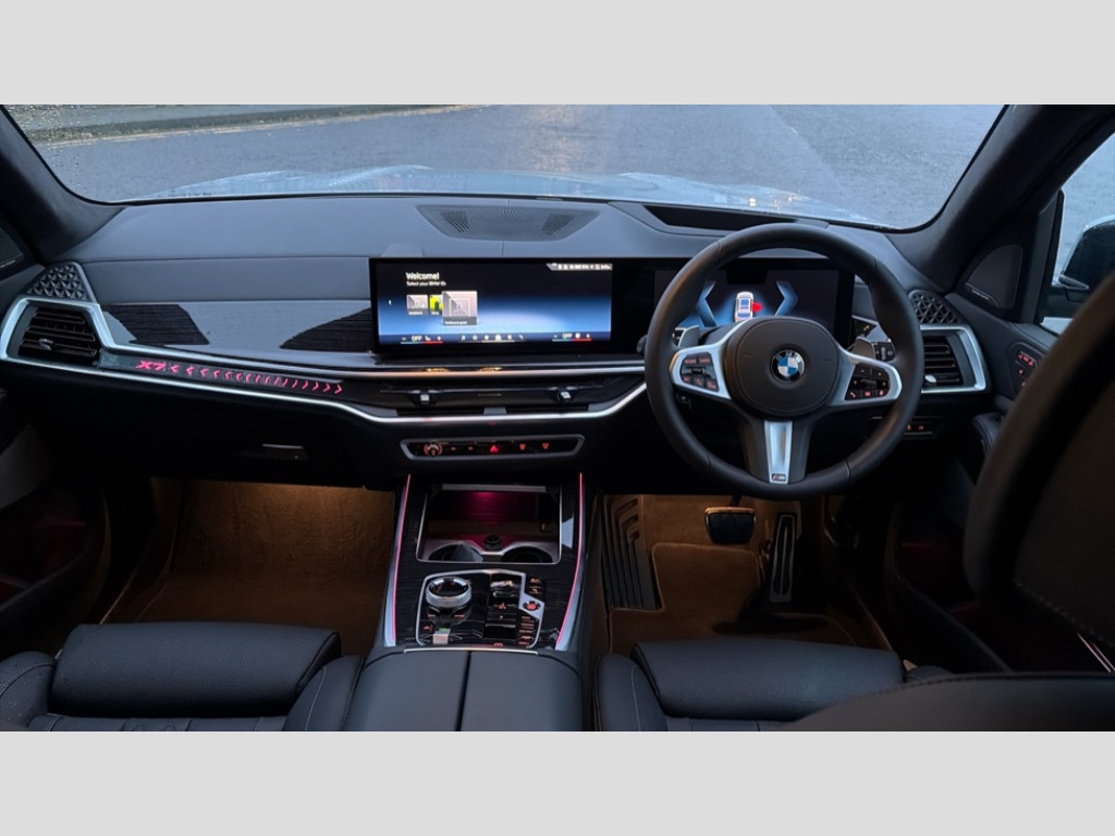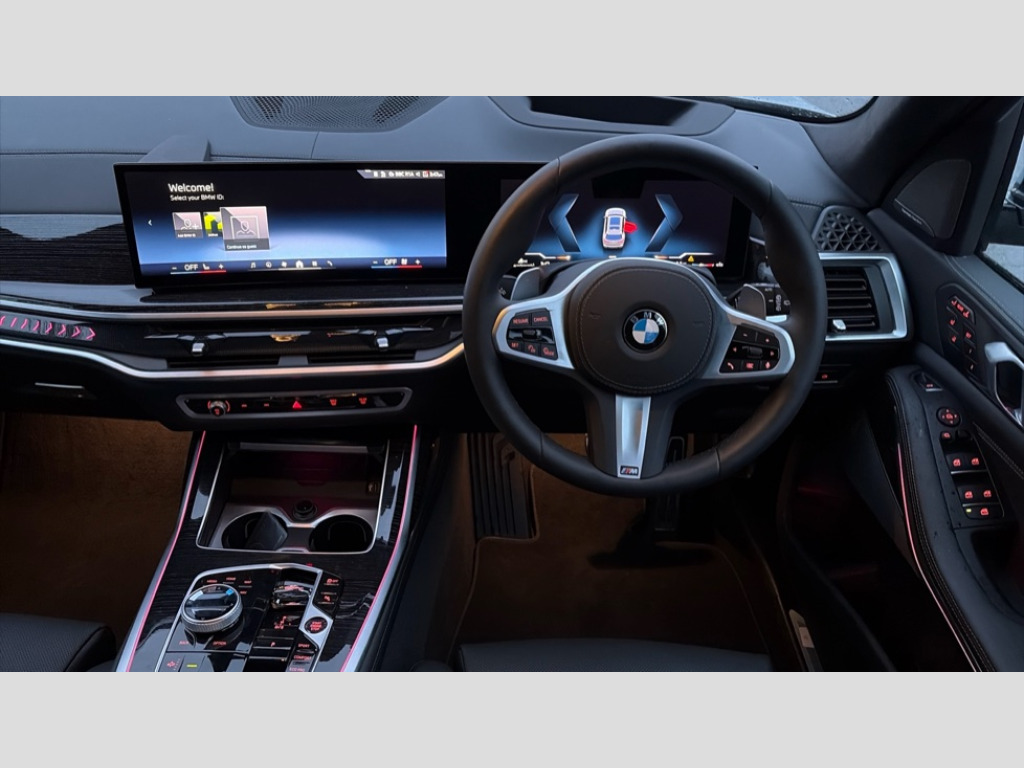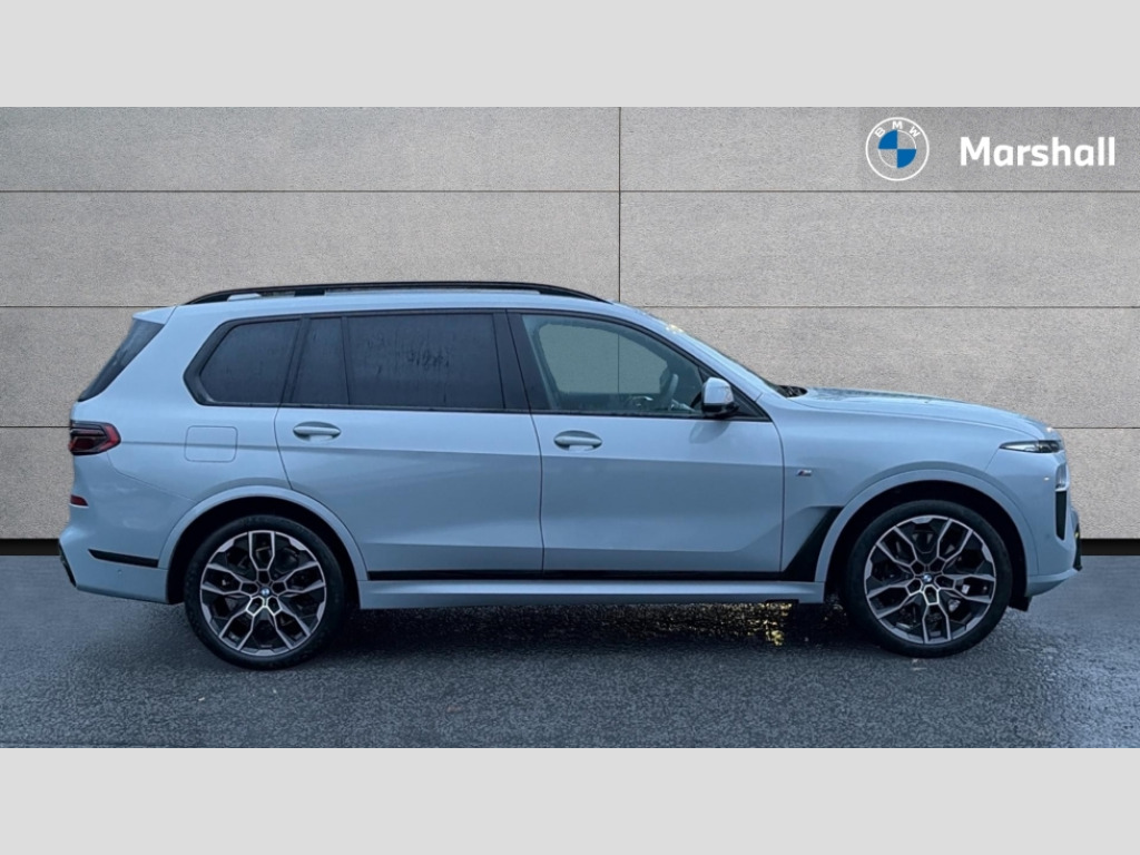 BMW X7 xDrive40d MHT M Sport 5dr Step Auto 2 rear USB-C ports, Attentiveness assist, Automatic start/stop function, Automatic tailgate operation, BMW ConnectedDrive online services, BMW Drive recorder, BMW gesture control, BMW Teleservices, Brake pad wear indicator in front and rear, Condition based service, Integrated owner's handbook, Live Cockpit Professional with head up display including 12.3" instrument cluster and 14.9" central display, Parking assistant pro including reversing assistant, PDC, lateral parking aid, reversing assist camera, parking drive off monitoring, 48V Mild hybrid technology, 8 speed automatic with steptronic transmission including automatic hold function and gearshift paddles on the steering wheel, Drive experience switch with comfort mode + ECO PRO + sport mode, Permanent all wheel drive, 2x Front USB (1x USB-C, 1x USB-A), DAB radio, Personal eSim, Acoustic glazing, Adaptive air flap control bars in high gloss black, Air breather and door claddings in high gloss chrome, Body coloured wheel arches, Dynamic brake lights with LED technology, Electrically adjustable and heated aspheric folding side mirrors with auto dimming, electric fold in function, automatic parking function, Exterior and central air inlets in front bumper painted pearl chrome, Follow me home headlight function, Frameless interior mirror, Front and rear electric windows, Heated windscreen washer nozzles, High beam assist, High gloss black shadow line roof rails, High gloss black shadowline trim in side/window frame, window recess cover, window guide, B and C pillar, mirror triangle, mirror base, mirror frame, Integrated turn indicators, LED daytime running lights, LED rear lights, LED third brake light in rear spoiler, Rain sensor with automatic headlight activation and windscreen wiper control, Rear side wing doors, Sump guard front and rear painted in silver, Trailer stabilisation logic, 12V - Power sockets with 2x centre console and 1x luggage compartment, 2 seat bench in 3rd row, 2x cupholders in front, rear centre armrest and two in third row seats, 3 seat bench in 2nd row, 3 spoke M leather multifunction steering wheel, 40:20:40 split folding rear seat backrests, Ambient lighting strip in the instrument panel with illuminated, Armrest in front centre console, Compartment in front of cupholder, Driver and front passenger sunvisors with illuminated vanity mirrors and ticket holder, Electrical steering column with adjustable height and length with activation and control on the steering column, Entry sills with illuminated M inscription, Fold down flush into floor of luggage compartment 50:50, Front and rear colour co-ordinated with all standard carpet colours, Front and rear door pockets, Front and rear side armrests integrated into door trim, Front seat back pockets, Grab handles, Height adjustable front headrests, Height adjustable rear headrests, Lockable glove compartment, Nano filter, Single front passenger seat, Soft close doors, Storage tray and compartment with lid in centre console, Wireless charging tray, Additional storage compartment pack - X7, Ambient light interior pack - X7, Connected Package Professional - X7, Interior lighting pack - X7, Luggage compartment pack - X7, M aerodynamics pack - X7, M Sport pack - X7, 3 point seatbelts on all seats, front pyrotechnic belt tensioners, stopper and belt force limiters, front and outer rear seats, Acoustic protection for pedestrians, Active protection, Airbag - Front driver and passenger, side airbags and Head airbags, Anti lock braking system (ABS) with cornering brake control, BMW emergency call, Child seat ISOFIX attachment rear outer seats in 2nd row and both seats in 3rd row includes top tether, Comfort access system with digital key plus, Comfort cushion seats for outer seats in 2nd row, Crash sensor inclu activation of airbags, interior light, safety battery terminal clamp, hazard warn flasher, unlock doors, deactivation of fuel pump, DSC - Dynamic Stability Control, Dynamic Traction Control - DTC, Electromechanical parking brake with automatic drive away release and auto hold function, Front and rear brake discs with interior ventilation, Hill descent control, Integrated braking system, Manual child lock in rear doors, PC iBrake PostCrash approach control warning with light braking function, Tyre pressure monitoring system, Tyre pressure sensors, Variable torque distribution, Warning triangle and first aid kit, Alarm, Central locking including 2 vehicle keys with integrated emergency key, Engine immobiliser, Locking wheel bolts, Galvanic embellisher for controls