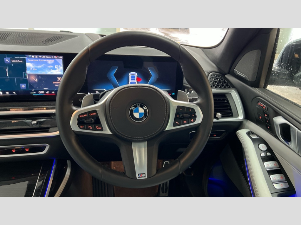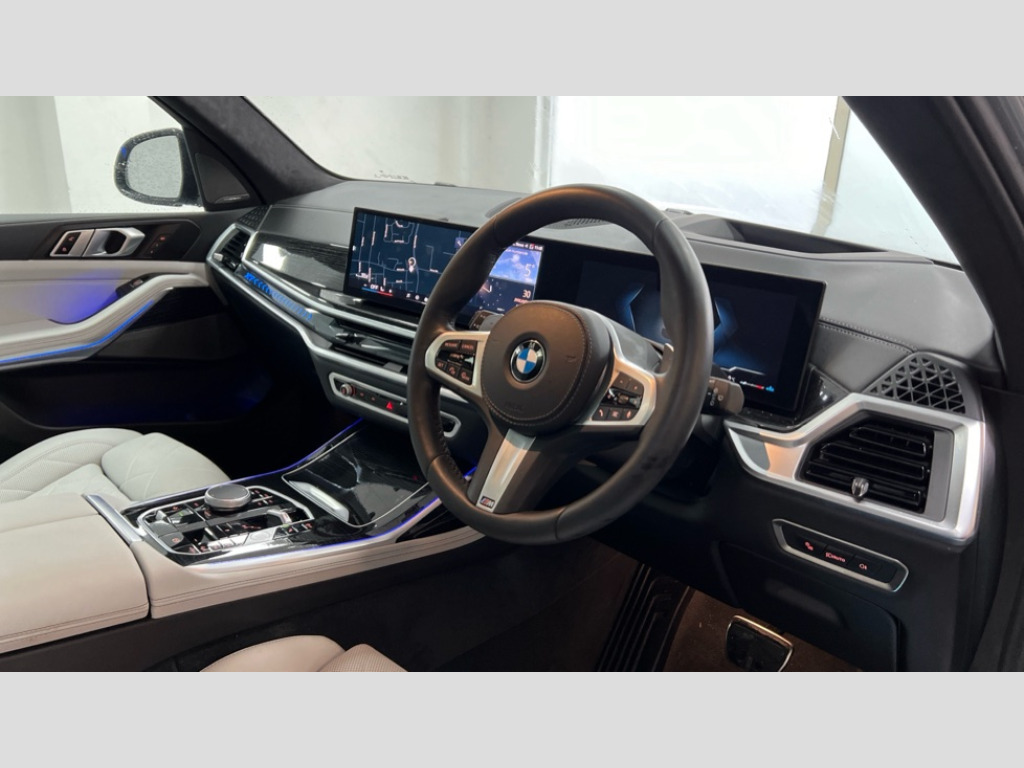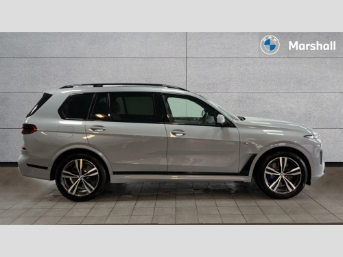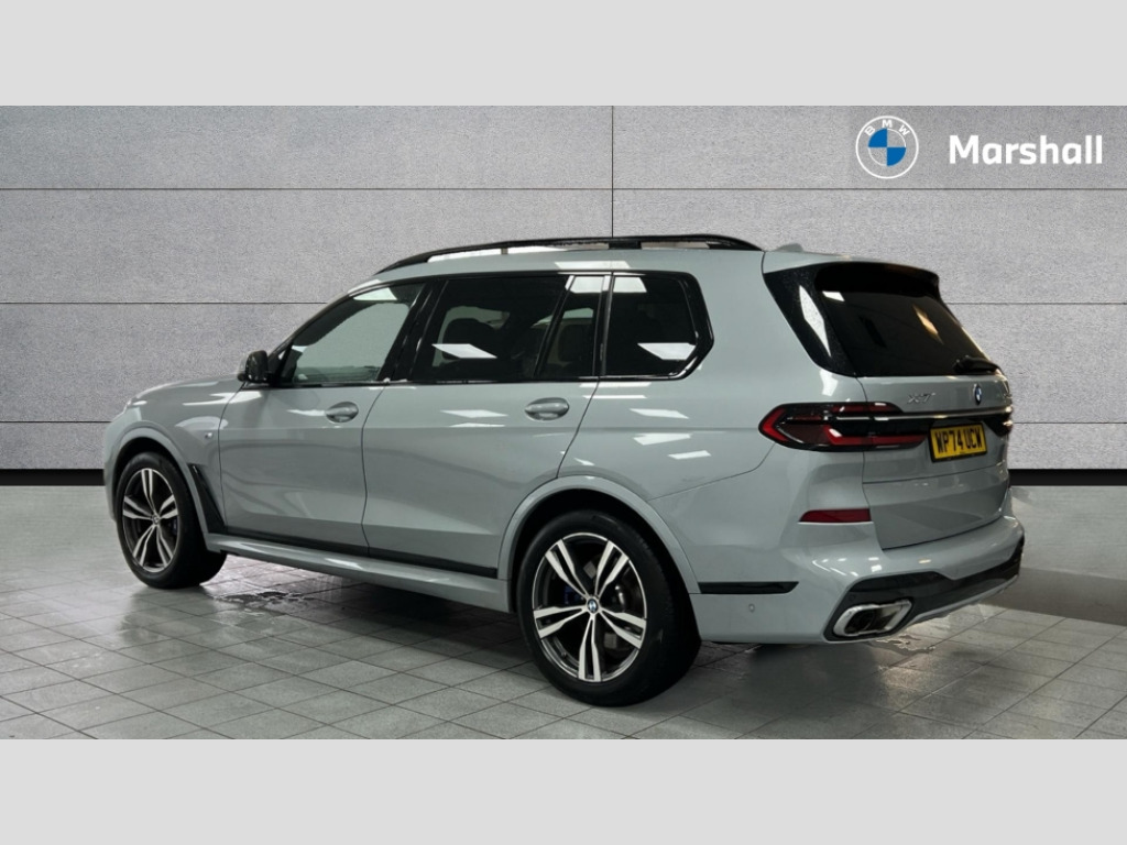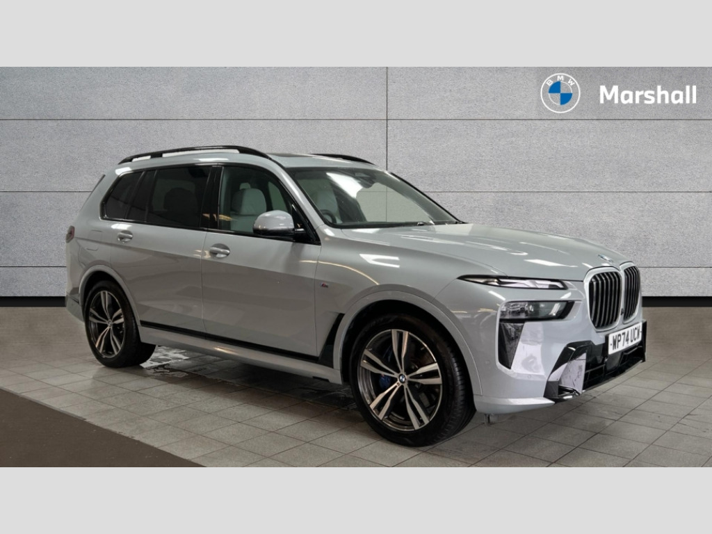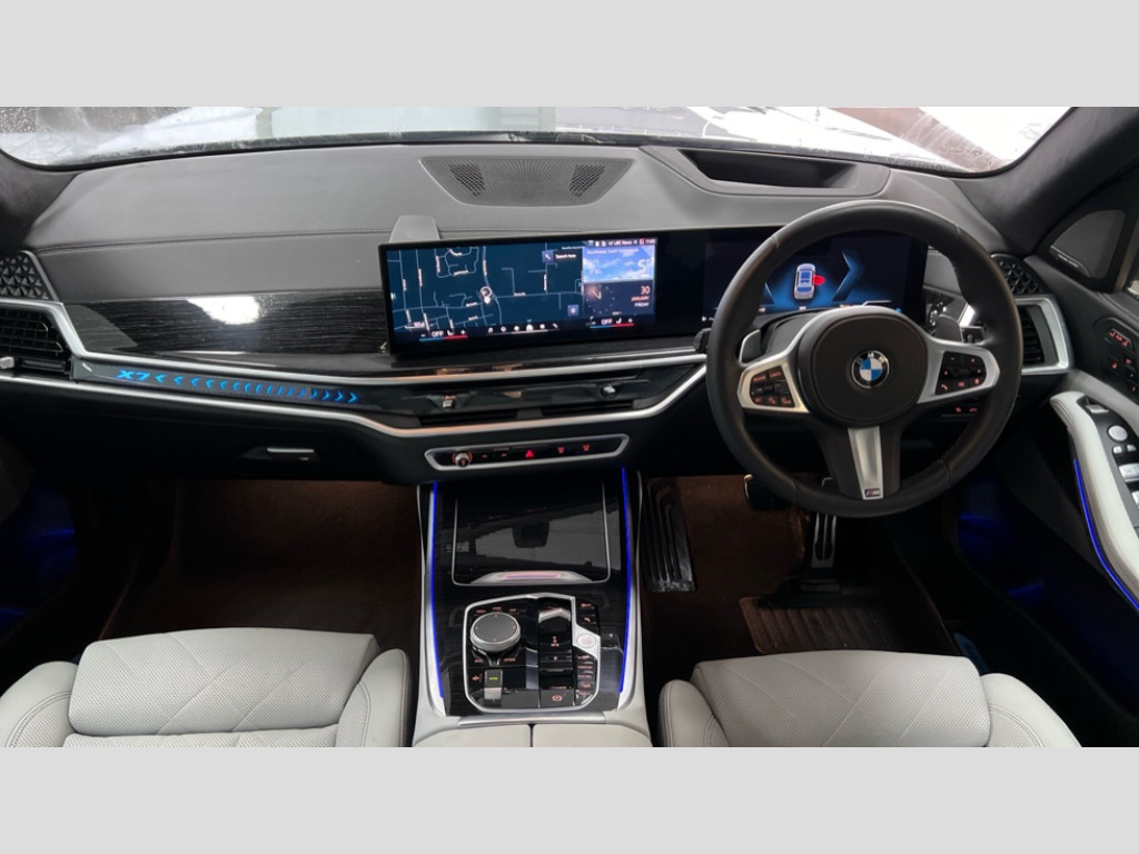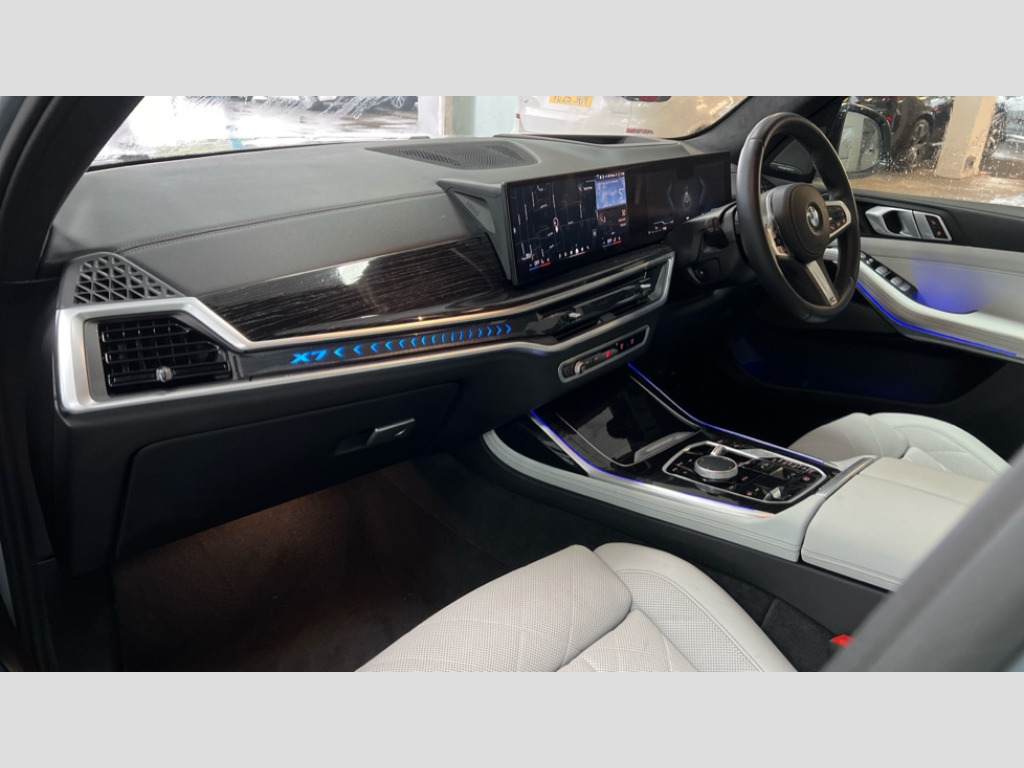 BMW X7 xDrive40i MHT M Sport 5dr Step Auto 2 rear USB-C ports, Attentiveness assist, Automatic start/stop function, Automatic tailgate operation, BMW ConnectedDrive online services, BMW Drive recorder, BMW gesture control, BMW Teleservices, Brake pad wear indicator in front and rear, Condition based service, Electric power steering with Servotronic steering optimised at all speed ranges, Integral active steering, Integrated owner's handbook, Live Cockpit Professional with head up display including 12.3" instrument cluster and 14.9" central display, Parking assistant pro including reversing assistant, PDC, lateral parking aid, reversing assist camera, parking drive off monitoring, Speed limiter, 48V Mild hybrid technology, 8 speed automatic with steptronic transmission including automatic hold function and gearshift paddles on the steering wheel, Drive experience switch with comfort mode + ECO PRO + sport mode, Permanent all wheel drive, 2x Front USB (1x USB-C, 1x USB-A), DAB radio, Acoustic glazing, Adaptive air flap control bars in high gloss black, Air breather and door claddings in high gloss chrome, Aluminium roof rails, Aluminium Running Board, Body coloured wheel arches, Dynamic brake lights with LED technology, Electrically adjustable and heated aspheric folding side mirrors with auto dimming, electric fold in function, automatic parking function, Exterior and central air inlets in front bumper painted pearl chrome, Follow me home headlight function, Frameless interior mirror, Front and rear electric windows, Front ornamental grille struts in chrome high gloss, Heated windscreen washer nozzles, High beam assist, High gloss black shadowline trim in side/window frame, window recess cover, window guide, B and C pillar, mirror triangle, mirror base, mirror frame, Integrated turn indicators, Kidney grille iconic glow, LED daytime running lights, LED rear lights, LED third brake light in rear spoiler, One piece front ornamental grille frame in pearl gloss chrome, Rain sensor with automatic headlight activation and windscreen wiper control, Rear side wing doors, Side window graphic in satinated aluminium, Sump guard front and rear painted in silver, Trailer stabilisation logic, 12V - Power sockets with 2x centre console and 1x luggage compartment, 2 seat bench in 3rd row, 2x cupholders in front, rear centre armrest and two in third row seats, 3 seat bench in 2nd row, 40:20:40 split folding rear seat backrests, BMW inscription in front and rear door entry sills with illuminated, Compartment in front of cupholder, Driver and front passenger sunvisors with illuminated vanity mirrors and ticket holder, Electrical steering column with adjustable height and length with activation and control on the steering column, Front and rear colour co-ordinated with all standard carpet colours, Front and rear door pockets, Front and rear side armrests integrated into door trim, Front seat back pockets, Grab handles, Height adjustable front headrests, Height adjustable rear headrests, Lockable glove compartment, M leather steering wheel, Nano filter, Single front passenger seat, Soft close doors, Storage tray and compartment with lid in centre console, Wireless charging tray, Additional storage compartment pack - X7, Ambient light interior pack - X7, Connected Package Professional - X7, Interior lighting pack - X7, Luggage compartment pack - X7, M aerodynamics pack - X7, 3 point seatbelts on all seats, front pyrotechnic belt tensioners, stopper and belt force limiters, front and outer rear seats, Acoustic protection for pedestrians, Active protection, Airbag - Front driver and passenger, side airbags and Head airbags, Anti lock braking system (ABS) with cornering brake control, Automatic Stability Control (ASC), BMW emergency call, Child seat ISOFIX attachment rear outer seats in 2nd row and both seats in 3rd row includes top tether, Comfort cushion seats for outer seats in 2nd row, Crash sensor inclu activation of airbags, interior light, safety battery terminal clamp, hazard warn flasher, unlock doors, deactivation of fuel pump, DSC - Dynamic Stability Control, Dynamic Traction Control - DTC, Electromechanical parking brake with automatic drive away release and auto hold function, Front and rear brake discs with interior ventilation, Hill descent control, Integrated braking system, Manual child lock in rear doors, PC iBrake PostCrash approach control warning with light braking function, Tyre pressure monitoring system, Tyre pressure sensors, Variable torque distribution, Warning triangle and first aid kit, Alarm, Central locking including 2 vehicle keys with integrated emergency key, Comfort access system, Engine immobiliser, Locking wheel bolts, Galvanic embellisher for controls