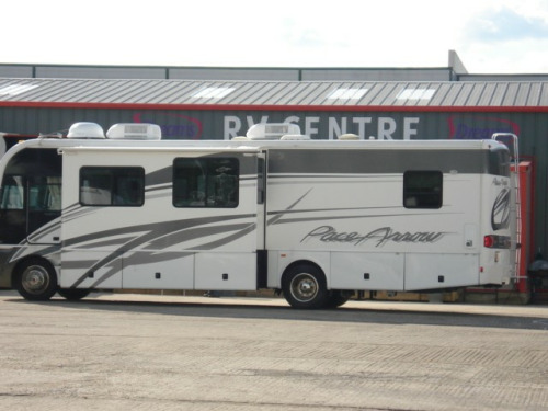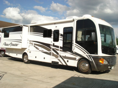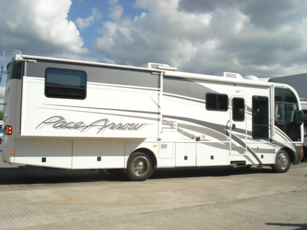 Fleetwood Pace Arrow 36B model. Chevy V8 Vortec Allison auto with X2 O/Ds. Grade brake. Workhorse W22 chassis with Triple slide outs. Drivers side door. Huge basement lockers all round. Rear East West Queen Island bed in in bedroom with ample cupboard and wardrobe storage. Separate W.C. Enclosed glass corner shower cubicle wash basin. Laminated type flooring through to kitchen/dinning area . kitchen area with all fitted appliances, Side by side F/ Freezer ice maker. All Corian worksurfaces throughout . Fitted washer/drier. Dinette and bed settee making good size six berth. Captains elec. 360 swivel chairs. All finished in Brown Ultra leather and Alcantara trim. Elec. Windows/heated mirrors. X2 solar panels. Onan 5.5 kva on board generator 240v 110v and 12v systems. Dual heating. Gas/Elec. 10 gall hot water tank. Fitted invertor. Dual pane windows all round. Fitted T.V. and remote dome satellite system. Elec sun awning with wind sensor slide topers all round. Full underbody protection. 22.5 Alcoa alloy wheels with tyre pressure sensors. Elec. windscreen sun blinds. Dirt skirt. UK spec. Tow hitch. Insurance alarm/immobiliser. Fitted Tracker. Plus all standard American R.V. refinements. This grat layout in this quality R.V. is in far above the average condition. One owner since import in 2009 . All documentation and history.All our RVs for sale are open to a full professional accredited written inspection.WE ARE UKs. No. 1 BUYER OF ALL CLEAN AND TIDY AMERICAN MOTORISED RVs.NO MESSING INSTANT PAYMENT PAID.H.P SETTLEDPart exchange and finance available. All our RVs are sold with our peace of mind warranty cover.The information on the above is provided for general information purposes only and is provided in good faith However we make no representation of any kind expressed or implied regarding the accuracy of any information in our advertising,