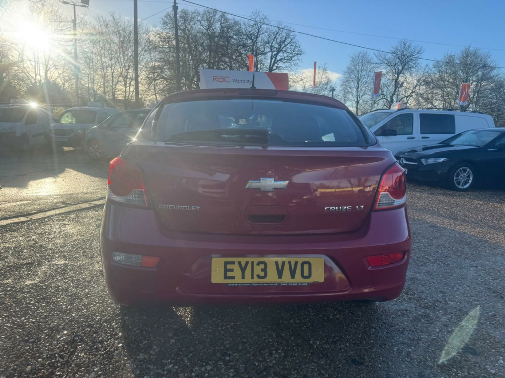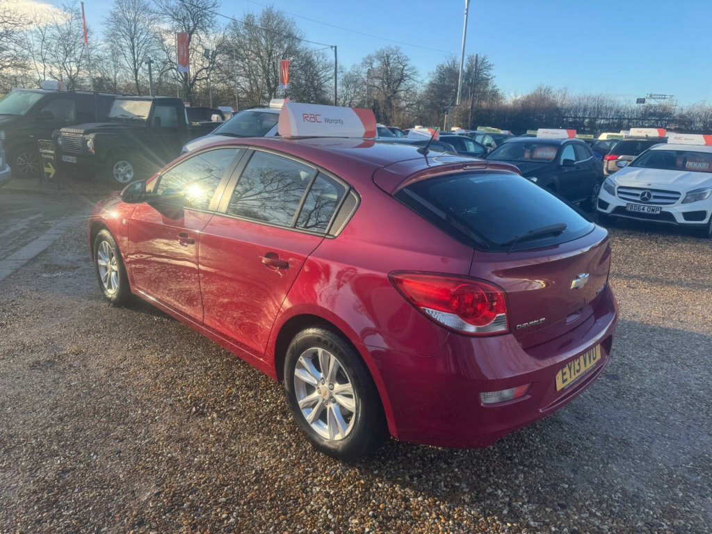 Discover this 2013 Chevrolet Cruze LT with exceptionally low mileage for its age, having covered just 37,200 miles. This well maintained example is powered by a 1.6 litre petrol engine and comes equipped with essential features for your comfort and convenience, including air conditioning to keep you cool and rear parking sensors to assist with manoeuvring.This Chevrolet Cruze LT offers practical advantages that set it apart. Its large boot space provides ample room for shopping or luggage, making it a versatile choice for everyday needs. Furthermore, its low insurance group rating indicates that running costs are likely to be more affordable compared to similar vehicles, offering excellent value for money.. Air conditioning, Rear Parking Sensors, 16in Alloy wheels, ABS - Anti-Lock Braking System, Aux in Socket, 2nd Row centre headrest, 4 Speakers, Airbag - Driver, Airbag - Front Passenger, Airbag - Front Side Impact, Airbag - Passenger Side Deactivation Switch, Airbag - Side Curtain, Alarm - Thatcham Category 1, Black Belt Line, Body Colour Door Handles, Body Colour Tailgate Handle, Child Proof Rear Door Locks, Chrome Effect Grille Surround, Cruise Control, Door Mirrors - Body Coloured, Door Mirrors - Electrically Heated/Adjustable, Drivers Information Centre, Drivers Sunglasses Holder, ESC - Electronic Stability Control, Electrically Operated Front and Rear Windows with Express Up and Down, Electronic Boot Release, Engine Immobiliser, Foldable Key, Follow Me Home Headlights, Front Fog Lights, Front Seat Belt Pretensioners, Front Seat Belt Reminder, Halogen Headlights, Height Adjustable Front Head Restraints, Height Adjustable Headlights, High Gloss Instrument Panel, ISOFIX Child Seat Restraint System for Outer Rear Seats, Infotainment Graphic Display, Interior Motion Sensor, Knee Protector, Leather Gear Knob, Lockable Glovebox, Luggage net, Pollen Filter, Power Steering, RDS radio/single disc CD player and aux in socket, Rear 12v Power Socket, Rear Armrest, Rear Convenience Hooks, Rear Heating Duct, Rear Pockets on Front Seat Backs, Rear Window Defogger, Rear window wiper, Remote Control Central Door Locking, Roof Antenna, Seats - 4 Way Adjustable Driver and Front Passenger, Seats - 60-40 Split Folding Rear, Side Impact Protection Beams, Steering Column - Tiltable and Telescopic, Steering Wheel - Audio Controls, Steering Wheel - Leather, Steering Wheel Operated Lock Control, Storage Box with Lid on Top of Dashboard, Sunvisors - Driver Illuminated and Passenger Covered Mirror, Tinted Windows with Shaded Windscreen Band, Traction Control, Tyre Repair Kit, Vehicle Inclination Sensor.