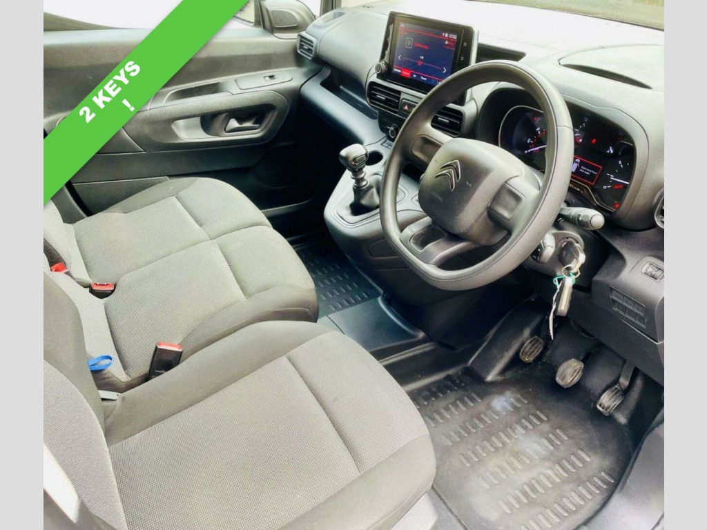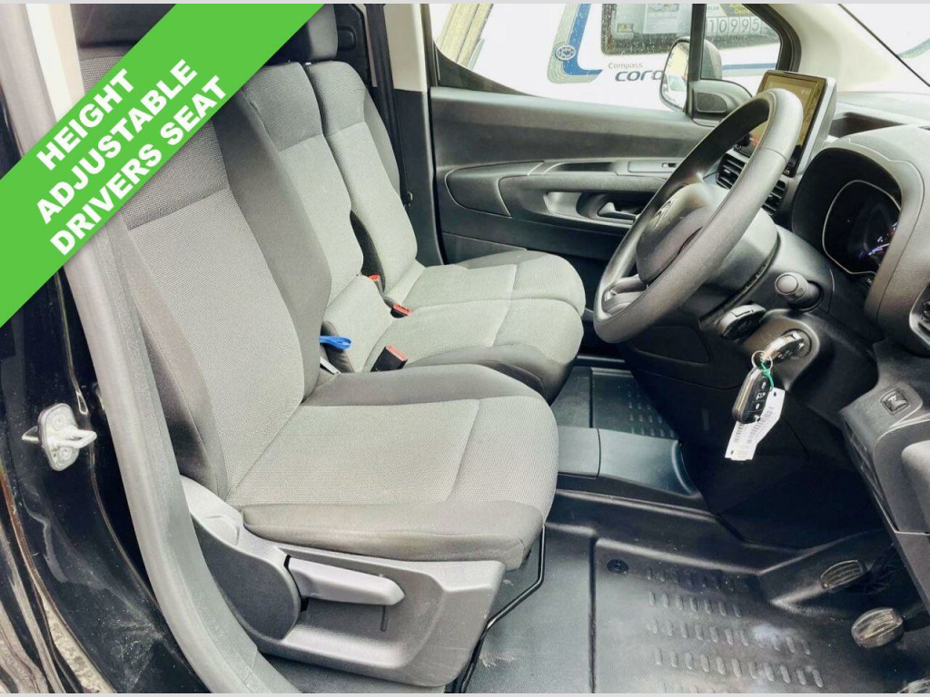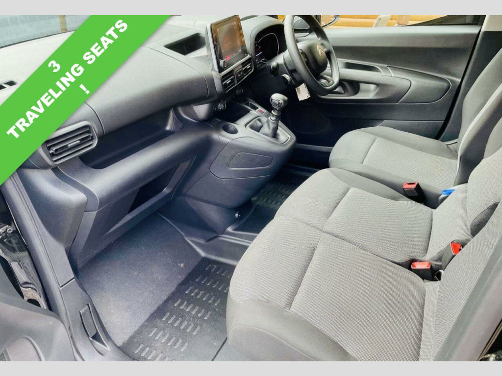 . 12V Socket in Dashboard, 16in Steel Wheels - Grey with Half Hubcap, 3-Spoke Sport Steering Wheel, 6 Floor-Mounted Load Securing Rings, Air Conditioning, Airbags - Driver, Audio Controls through Steering Wheel Buttons, Automatic Activation of Hazard Warning Lights on Major Deceleration, Black Door Handles, Citroen Connect Box with Emergency and Assistance System, Citroen Connected Services, Cruise Control with Programmable Speed Limiter, Cup Holders for Driver and Passenger on Either Side of the Dashboard, Dashboard Mounted Central Locking Push Buttons and Auto Locking Above 7 MPH, Door Opening Warning Light and Audible Lights-On Warning, Driver and Passenger Seatbelt Unfastened Warning, Drivers Seat - 4-Way Adjustable, ESC with Hill Start Assist - ABS Braking including EBA and EBFD, Electric Power Assisted Steering with Reach and Rake Adjustable Steering Column, Electric Windows - Front with One Touch Operation, Electrically Adjustable Heated Door Mirrors, Free2Move Connect Fleet Telematics (6 Month Subscription From New), Front and Rear Bumper - Black, Full Bulkhead with Clothes Hook, Hard Plastic Floor Protection in Cabin, Height Adjustable Halogen Headlights, High Level Third Brake Light, Lockable Fuel Cap, Manual Folding Exterior Mirrors, Manual Parking Brake, Multi-Function On-Board Trip Computer, Multimedia with 8in Touchscreen, Nearside Side Sliding Door, Overhead Storage Shelf in Cabin, Primary and Spare Folding Keys, Remote Central Locking with Deadlocks, Rev Counter with Maintenance and Gear Efficiency - GEI - Indicators, Rolling Code Transponder Immobiliser, Side Protection - Black, Single Passenger Seat, Top Box Storage Compartment, Two-Speed and Intermittent Front Wipers, Tyre Inflation Kit in lieu of Spare Wheel, Tyre Pressure Monitor, Unglazed Asymmetric Rear Doors Opening to 180 Degrees, Visible VIN at Base of Windscreen, White Text LCD Instrument Panel, Perla Nera Black, Rear Parking Sensors, Multimedia Navi Pro with 8in Touchscreen, Extenso Modular Bulkhead and Passenger Bench Seat, Comfort Pack, Spare Wheel.
