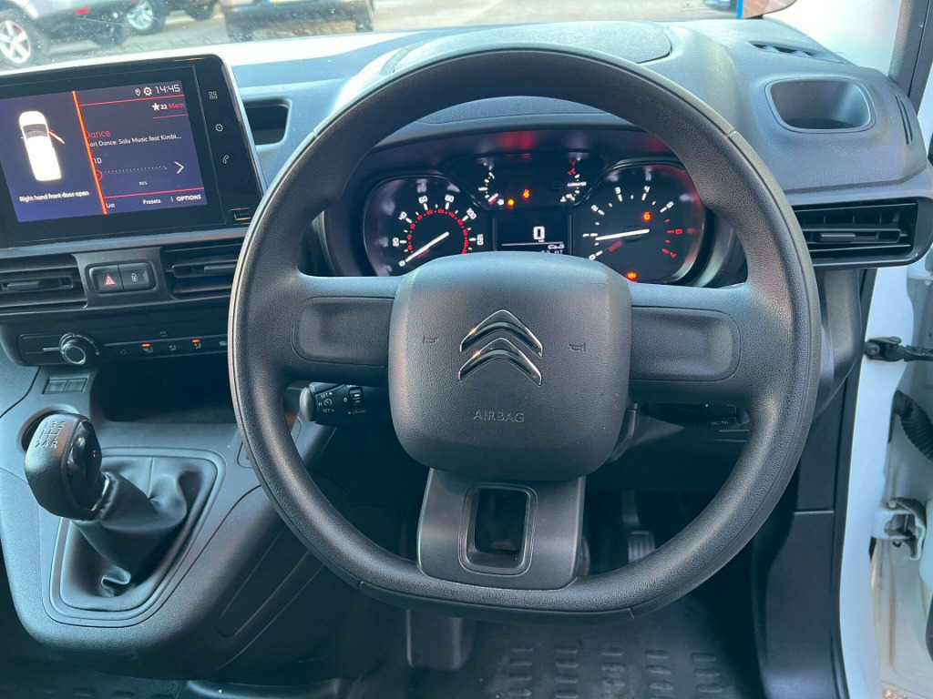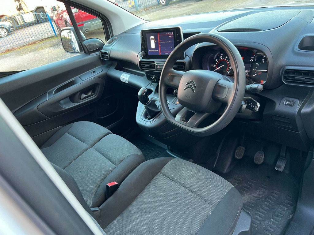 This 2021 Citroen Berlingo has a comprehensive service history with its last service completed on 03/12/2025 at 75,700 miles, ensuring excellent provenance. This Enterprise M Pro SWB Euro 6 model is equipped with a 1.5L BlueHDi diesel engine and features height adjustable halogen headlights with automatic activation, an 8in colour touchscreen with Citroen Connect DAB radio, Bluetooth handsfree, USB and Aux in sockets, rear parking sensors, and air conditioning.The Citroen Berlingo stands out with its impressive fuel economy, achieving up to 55 mpg, which is better than many vehicles in its class. Furthermore, its low CO2 emissions and low insurance group highlight its cost effectiveness for everyday use. A 12 month MOT will be provided upon purchase, offering peace of mind for the new owner. v socket in dashboard, 15in steel wheels with twin wheel cover, 6 floor-mounted load securing rings, 6 way adjustable drivers seat - includes lumbar adjustment and under seat storage, 8in colour touchscreen with citroen connect dab radio - bluetooth handsfree - usb socket and aux-in jack, air conditioning, airbags - driver, alarm - parametric and volumetric - thatcham category 1 approved alarm with tilt sensor, automatic activation of hazard warning lights on major deceleration, automatic electronic parking brake, citroen connect box with emergency and assistance system, cruise control with programmable speed limiter, cup holders for driver and passenger on either side of the dashboard, dashboard mounted central locking push buttons and auto locking above 7 mph, door opening warning light and audible lights-on warning, drivers seat height adjustment - lumbar - rake and reach adjustment, esc with hill start assist - abs braking including eba and ebfd, extenso modular folding passenger bench seat with pivoting writing table - storage under central seat - load through hatch in bulkhead and load protection cover compliant with iso27956, electric power assisted steering with reach and rake adjustable steering column, electric windows - front with one touch operation, electrically folding - adjustable door mirrors with temperature sensors, front door pockets with 1.5l bottle holders, front fog lights, full bulkhead, hard plastic floor protection in cabin, height adjustable halogen headlights, high level third brake light, lockable fuel cap, multi-function on-board trip computer, nearside side sliding door, overhead storage shelf, rear parking sensors, remote central locking with deadlocks, rev counter with maintenance and gear efficiency - gei - indicators, rolling code transponder immobiliser, seat belt unfastened warning - driver, side rubbing strips, spare wheel - full size steel, top box storage compartment, two-speed and intermittent front wipers, tyre pressure monitor, unglazed asymmetric rear doors opening to 180 degrees, visible vehicle identification number at base of windscreen