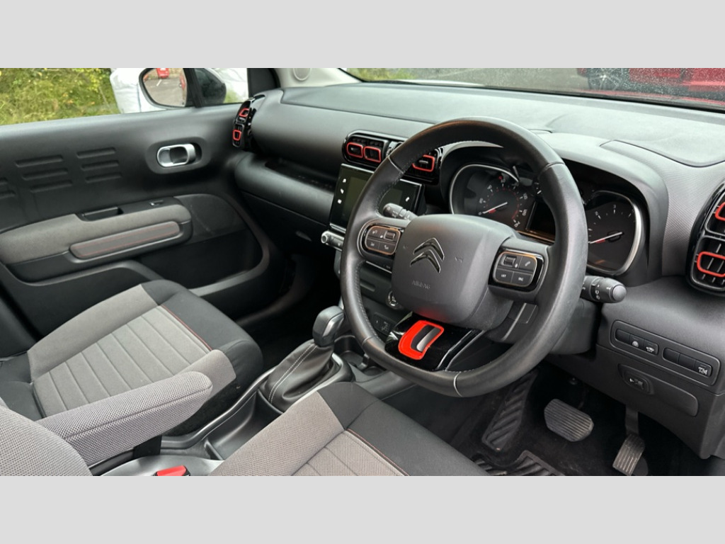 Citroen C3 Aircross 1.2 PureTech 130 Flair 5dr EAT6 7" colour touch screen, Citroen connected nav with connect box and emergency assist system, Coffee Break Alert, Cruise control + speed limiter, Lane departure warning system, Mirror screen with mirror link, apple carplay and android auto, Multi function on board trip computer, Rear parking sensors, Rev counter, Speed limit recognition and recommendation, Variable PAS, Bluetooth hands free and media streaming with USB socket and jack, Citroen connected DAB radio with 6 speakers, Steering wheel mounted controls for stereo and telephone, Auto dimming electrochrome rear view mirror, Automatic lights, Automatic windscreen wipers, Body colour bumpers, Body colour painted door handles, Dark tinted rear windows, Electric front windows + one touch + anti-pinch, Electric rear windows + anti-pinch, Electrically adjustable, heated and folding door mirrors, Front and rear aluminium effect bumper protectors, Front fog lights with cornering function, Halogen headlights with LED daytime running lights, Rear wiper, 0.5L Large bottle rear door storage, 1.5L Large bottle front door storage, 12 volt front socket, 12 volt rear socket, 60/40 split folding rear seat, Additional 12V socket in the rear, Automatic air conditioning, Boot light, Driver and passenger sunvisor with courtesy mirror, Flex load/Pull out boot floor, Front courtesy reading lights, Grey soft touch dashboard facia, Height adjustable driver's seat, Height adjustable front headrests, Height and reach adjustable steering wheel, ISOFIX outer rear seats mounting points including top tether, Lashing eyelets in boot, Leather gear knob, Leather steering wheel with satin chrome inserts and radio controls, Rear centre armrest/ski flap, Sliding rear bench, Three height adjustable rear head restraints, Tilt adjustable rear seats (Two positions), ABS with Electronic brakeforce distribution and Emergency braking assistance, Active safety brake, Airbags - Driver/front passenger, front lateral and curtain, Drivers/passengers and rear seats unfastened seat belt warning, Electronic stability control, Five 3 point inertia reel seat belts, Forward collision alert, Front seatbelt pretensioners, Hill start assist function, Manual rear child locks, Tyre pressure monitor, Alarm, Automatic boot locking, Automatic door locking, Immobiliser, Keyless entry and start, Locking wheel nuts, Remote central locking + deadlocks, 17" Diamond cut 4 ever alloy wheels, Space saver spare wheel