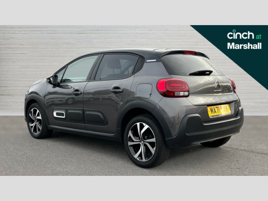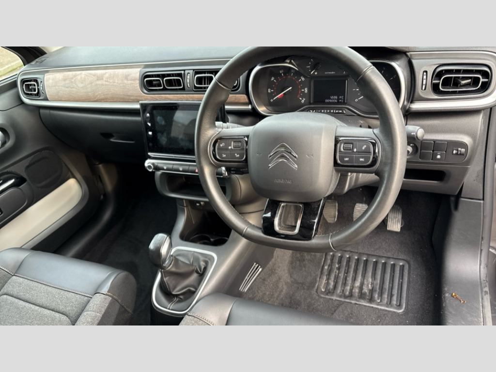Citroen C3 1.2 PureTech Shine Plus 5dr Citroen connect box emergency and assistance system, Coffee Break Alert, Cruise control + speed limiter, Exterior temperature display, Multi function trip computer, Rear parking sensors, Reversing camera, Satin chrome surround instrument cluster with white LCD and analogue gauges, Variable assistance power steering, USB connection, 3D rear light signature, Automatic activation of hazard warning lights, Body colour bumpers, Body colour door handles, Chrome decoration on front face, under chevrons and around daytime running lights, Citroen illuminated signature in LED headlights and LED daytime running lights, Dark tinted tailgate and rear side windows, Electric folding and heated door mirrors, Electrochrome auto dimming interior rear view mirror, Fog lights integrated into front bumper, Front sequential electric windows with one-touch open/close and anti-pinch system, Gloss black finish B pillar, LED Headlights, Rear sequential electric windows with one-touch open/close and anti-pinch system, Rear windscreen wiper with intermittent mode linked to vehicle speed and automatic activation when reverse gear selected, Roof colour rear view mirror caps, 1/3 to 2/3 split folding rear seat, 12V socket, Automatic air conditioning, Boot light, Cloth/leather effect upholstery, Driver and passenger's sun visor with courtesy mirror, Driver's central armrest, Driver's seat height adjustment, Front lighting panel with map reading lights, Front seats adjustable with forward back slide and adjustable backrest, Height adjustable front head restraints, Height/reach adjust steering wheel, ISOFIX mounting on outer rear seats with top tether and labels indicating fixing points, Leather steering wheel with gloss black + satin chrome elements and audio/telephone controls, Leather trimmed gear lever with leather effect gaiter and overstitching, Map pockets in back of driver and front passenger seats, Parcel shelf, Seatbelt unfastened on the move audible and visual alert for front and rear seats, Storage space under touchscreen with rubber mat, Three rear seats with head restraints, Upholstered armrest in front and rear doors, Safety pack 1 - C3, Safety Pack 2 - C3 Shine Plus, Shine Technology Pack - C3 Shine Plus, Visibility pack with automatic lights - C3, ABS with Electronic brakeforce distribution and Emergency braking assistance, Driver and front passenger seatbelts with pyrotechnic pretensioners and force limiters, Driver's airbag, Electric child locks, ESP with anti skid system, Front passenger airbag, Front passenger airbag deactivation, Front side airbags + front/rear curtain airbags, Hill start assist, Manual parking brake with leather handle and chrome finish button, Mono-tone horn, Outer rear seats with pretensioners and force limiters, Three rear 3-point seatbelts, Tyre pressure monitoring system, Anti theft alarm, Automatic door and boot locking when moving off with automatic unlocking in case of impact, Central locking with locked indicator and interior one touch lock button, Immobiliser, Remote control central locking with two plip keys, 17" Vector diamond cut alloy wheels, Tyre puncture repair kit