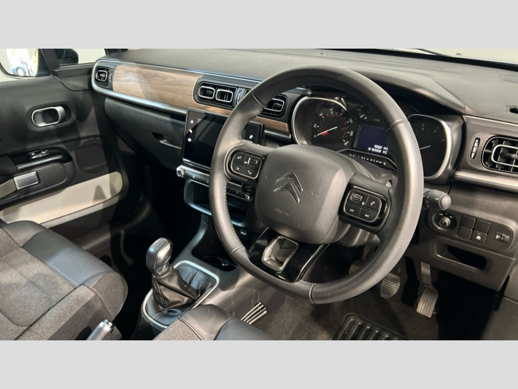 Citroen C3 1.2 PureTech Shine Plus 5dr Citroen connect box emergency and assistance system, Citroen connected nav with DAB, 6 speakers, 7" captive touch screen, mirror screen includes apple carplay/android auto and bluetooth, Coffee Break Alert, Cruise control + speed limiter, eCall emergency call system, Exterior temperature display, Multi function trip computer, Reversing camera, Satin chrome surround instrument cluster with white LCD and analogue gauges, Variable assistance power steering, USB connection, 3D rear light signature, Airbump on side door panel, Auto dimming electrochrome rear view mirror, Auto headlights, Automatic activation of hazard warning lights, Body colour bumpers, Body colour door handles, Chrome decoration on front face, under chevrons and around daytime running lights, Citroen illuminated signature in LED headlights and LED daytime running lights, Dark tinted tailgate and rear side windows, Electric folding and heated door mirrors, Fog lights integrated into front bumper, Front sequential electric windows with one-touch open/close and anti-pinch system, Front windscreen wipers with two speeds and intermittent mode linked to vehicle speed, Gloss black finish B pillar, LED Headlights, LED third brake light, Rear sequential electric windows with one-touch open/close and anti-pinch system, Rear side wing doors, Rear windscreen wiper with intermittent mode linked to vehicle speed and automatic activation when reverse gear selected, Roof colour rear view mirror caps, 1/3 to 2/3 split folding rear seat, 12V socket, 3 seat bench in 2nd row, Automatic air conditioning, Boot light, Cloth/leather effect upholstery, Driver and passenger's sun visor with courtesy mirror, Driver's central armrest, Driver's seat height adjustment, Front lighting panel with map reading lights, Front seats adjustable with forward back slide and adjustable backrest, Height adjustable front head restraints, Height/reach adjust steering wheel, ISOFIX mounting on outer rear seats with top tether and labels indicating fixing points, Leather steering wheel with gloss black + satin chrome elements and audio/telephone controls, Leather trimmed gear lever with leather effect gaiter and overstitching, Map pockets in back of driver and front passenger seats, Parcel shelf, Seatbelt unfastened on the move audible and visual alert for front and rear seats, Single front passenger seat, Storage space under touchscreen with rubber mat, Three rear headrests, Upholstered armrest in front and rear doors, Safety pack 1 - C3, Safety pack 2 - C3, Visibility pack with automatic lights - C3, ABS with Electronic brakeforce distribution and Emergency braking assistance, Driver and front passenger seatbelts with pyrotechnic pretensioners and force limiters, Driver's airbag, Electric child locks, ESP with anti skid system, Front passenger airbag, Front passenger airbag deactivation, Front side airbags + front/rear curtain airbags, Hill start assist, Manual parking brake with leather handle and chrome finish button, Mono-tone horn, Outer rear seats with pretensioners and force limiters, Three rear 3-point seatbelts, Tyre pressure monitoring system, Anti theft alarm, Automatic door and boot locking when moving off with automatic unlocking in case of impact, Central locking with locked indicator and interior one touch lock button, Immobiliser, Remote control central locking with two plip keys, 17" Vector diamond cut alloy wheels, Tyre puncture repair kit