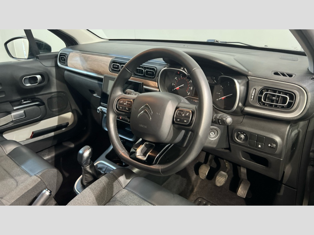 Citroen C3 1.2 PureTech Shine Plus 5dr Citroen connect box emergency and assistance system, Coffee Break Alert, Cruise control + speed limiter, Exterior temperature display, Multi function trip computer, Rear parking sensors, Reversing camera, Satin chrome surround instrument cluster with white LCD and analogue gauges, Variable assistance power steering, USB connection, 3D rear light signature, Automatic activation of hazard warning lights, Body colour bumpers, Body colour door handles, Chrome decoration on front face, under chevrons and around daytime running lights, Citroen illuminated signature in LED headlights and LED daytime running lights, Dark tinted tailgate and rear side windows, Electric folding and heated door mirrors, Electrochrome auto dimming interior rear view mirror, Fog lights integrated into front bumper, Front sequential electric windows with one-touch open/close and anti-pinch system, Gloss black finish B pillar, LED Headlights, Rear sequential electric windows with one-touch open/close and anti-pinch system, Rear windscreen wiper with intermittent mode linked to vehicle speed and automatic activation when reverse gear selected, Roof colour rear view mirror caps, 1/3 to 2/3 split folding rear seat, 12V socket, Automatic air conditioning, Boot light, Cloth/leather effect upholstery, Driver and passenger's sun visor with courtesy mirror, Driver's central armrest, Driver's seat height adjustment, Front lighting panel with map reading lights, Front seats adjustable with forward back slide and adjustable backrest, Height adjustable front head restraints, Height/reach adjust steering wheel, ISOFIX mounting on outer rear seats with top tether and labels indicating fixing points, Leather steering wheel with gloss black + satin chrome elements and audio/telephone controls, Leather trimmed gear lever with leather effect gaiter and overstitching, Map pockets in back of driver and front passenger seats, Parcel shelf, Seatbelt unfastened on the move audible and visual alert for front and rear seats, Storage space under touchscreen with rubber mat, Three rear seats with head restraints, Upholstered armrest in front and rear doors, Safety pack 1 - C3, Safety Pack 2 - C3 Shine Plus, Shine Technology Pack - C3 Shine Plus, Visibility pack with automatic lights - C3, ABS with Electronic brakeforce distribution and Emergency braking assistance, Driver and front passenger seatbelts with pyrotechnic pretensioners and force limiters, Driver's airbag, Electric child locks, ESP with anti skid system, Front passenger airbag, Front passenger airbag deactivation, Front side airbags + front/rear curtain airbags, Hill start assist, Manual parking brake with leather handle and chrome finish button, Mono-tone horn, Outer rear seats with pretensioners and force limiters, Three rear 3-point seatbelts, Tyre pressure monitoring system, Anti theft alarm, Automatic door and boot locking when moving off with automatic unlocking in case of impact, Central locking with locked indicator and interior one touch lock button, Immobiliser, Remote control central locking with two plip keys, 17" Vector diamond cut alloy wheels, Tyre puncture repair kit