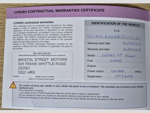 This 2017 Citroen C4 BlueHDi Flair is a standout example, having been cherished by just one owner from new and boasting a full service history. With only 57,400 miles on the clock, this Euro 6 compliant diesel model offers excellent provenance. It comes equipped with rear parking sensors, including parking assistance, to make manoeuvring easier. You'll appreciate the impressive fuel economy of this C4, achieving an outstanding 79 miles per gallon, which is significantly better than many other vehicles of its type. This efficiency, combined with its low CO2 emissions, makes it a cost effective choice. Furthermore, the generous boot space ensures you have plenty of room for shopping, luggage, or any other items you need to carry. The MOT is valid until January 2027, providing peace of mind for the coming years. Comes with 8 stamps in the Service Book with the last service carried out May '25 at 55,477 miles and it has 2 Keys. See below for its full list of features. Book today to view and test drive. Open 7 days a week. All part exchanges welcome. Please ask for details of our finance and extended warranty options, subject to status, T's and C's apply. 7in Touchscreen DAB Radio-MP3 CD , Bluetooth Telephone, Cruise Control and Speed Limiter with Fa, Automatic Dual Zone Air Conditioning, Rear Parking Sensors, 16in Wembley Alloy Wheels , USB Port, Height Adjustable Front Seats, Drivers Lumbar Adjustment, Front and Rear Electric Windows, Leather Steering Wheel with Chrome Inser, Leather Look Gear Knob-Gaiter and Chrome, Height and Reach Adjustable Steering Whe, Grey Liberal Cloth Upholstery, Split Folding Rear Seats, Halogen Headlights with LEDs, Electrically Adjustable Folding Door Mir, Light Tinted Rear Windows, Daytime Running Lights, Front Fog Lights with Cornering Function, Chrome Door Mirrors, Chrome Side Window Sills, Body Colour Front