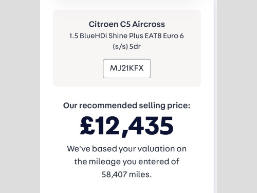 Citroen C5 Aircross Shine Plus (2021)1.5 BlueHDi Shine Plus SUV 5dr Diesel EAT8 Euro 6 (s/s) (130 ps)Two former keeper 2 keys partial service history, MOT Due: 25/03/2026Please vehicles come with Fresh MOT New service and 3 Months Gold Warranty ((( category S It was damaged in the passenger side front bumper Nothing Rear View Mirror, Automatic Door Locking When Moving Off, Automatic Dual Zone Climate Control, Auxiliary Point, Bluetooth Telephone Facility, Body Colour Door Handles, Body-Colour Rear Spoiler with Stainless Steel Edging Trim, C5 Aircross Monogramme on Boot Rear, Central 8in Capacitive Touch Screen, Citroen Connect Nav, Citroen Logo and Monogramme on Rear, Coffee Break Alert, Collision Risk Alert, DAB - Digital Audio Broadcasting - AM-FM and MP3 Compatible Radio with Two Tweeters and Four Speakers, DSC - Dynamic Stability Control and ASR - Electronic Anti-Skid System, Dark Tinted Rear Windows and Rear Windscreen, Dimmable White Mood Lighting, Driver Attention Alert, ECO Plus Mode, ESP - Electronic Stability Programme including Traction Control, Electric - Heated and Folding Body Coloured Door Mirrors with Integrated LED Indicator and Kerb Puddle Light, Electric Driver Seat Adjustment - Height - Fore/Aft and Backrest Angle, Electronic Parking Brake, Extended Traffic Sign Recognition and Recommendation, Fixing Rings in Load Area x4, Front Fog Lights with Cornering Function, Front Interior Light with Reading Spotlights x2 and Rear Interior Light with Timer, Front Optimised Safety Headrests and Rear Retractable Headrests x3 Height Adjustable, Front Parking Sensors, Front Three-Point Retractable Seatbelts - Height-Adjustable - with Pre-Tensioners and Force Limiters, Front and Rear LED Welcome and Reading Lights, Gear Lever - Satin Chrome, Gloss Black - A and B Pillar, Gloss Black Touch Screen Surround with Integrated Tactile Buttons and Chrome Finisher, Halogen Rear Fog Lights, Halogen Rear Numberplate Lights, Hands-Free Tailgate - Button on Key - Dashboard or Foot Operation Possible, Highway Driver Assist, Hinged Parcel Shelf, Horn - Two-Tone, Intelligent Beam Headlights, Keyless Entry and Start, LED Front Indicators, LED Headlights, Leather Effect Interior Door Handles, Longitudinal Roof Rails, Magic Wash, Manual Passenger Seat Adjustment - Height - Fore-Aft and Backrest Angle, Matt Black Lower Rear Skirt, Matt Black Rear Bumper Facia with Chrome Exhaust Effect Trim, Matt Black Side Sill with Airbump Panels and Anodised Silver Colour Touch, Matt Black Wheel Silver Anodized Colour Pack, Smooth Opening Flocked Glove Speed Limit Recognition System and Recommendation, Stainless Steel Front Citroen Embossed Sill Scuff Plates, Stainless Steel Front Inner Door Sills with Citroen Embossing, Steering Wheel with 2 Control Panels and Satin Chrome Inserts, Suspension with Progressive Hydraulic Cushions - PHC, Tyre Under Inflation Indicator - Indirect System, Visibility Pack, Voice Recognition, Wireless Smartphone Charging, Hi, I've had five cars since yesterday. None of those cars shows on my eBay motors can you please add that for me thanks