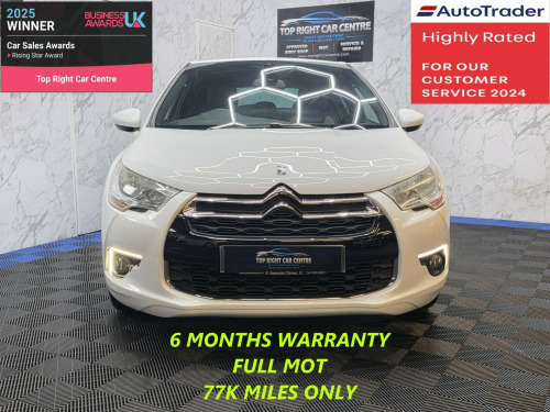 *** NIL DEPOSIT FINANCE AVAILABLE *** ***HPI CLEAR ***6 MONTHS WARRANTY AND BREAKDOWN COVER WITH THIS CAR (0% interest 9 months payment plan for extended warranty options are available for 1 or 2 years).Low mileage 77k miles. Low insurance group.FULL SERVICE HISTORY. FULL MOT ON SALE. We just done the fresh service.This stunning Citroen DS4 has been sourced directly from its Previous Private Owner. Every now and again, a car comes into stock at Top Right Car Centre, that you cannot help but fall in love with.Top Spec DStyle has part leather interior, massaging front seats with lumbar support, daytime running Led lights, auto folding electric side mirrors, electric windows, digital dual climate control, privacy glass, parking sensors, cruise control. Clean Car in White colour. Great comfortable car. Well maintained body work and interior. Bullet fast response. Checked by our engineers. Professionally detailed. Good reliable runner. Price checked. We've just completed a full pre delivery inspection on the car to give you complete piece of mind. 2 central locking keys. Smooth gear box. Clean alloy wheels. Excellent condition tyres. Multimedia has Bluetooth RADIO CD mp3 USB AUX. Run with no fault strong reliable engine. Good fuel economy. First to see will buy it this well looked after car. p/x welcome. We do price our cars/van as competitively as possible and because of this we sell cars/vans very quickly. BE QUICK! MISS IT - MISS OUT. With so much variety, quality and highly rated award winner 2024 and 2025, it is no wonder we are super busy all the time. Why Buy From Top Right Car Centre?Thoroughly Inspected Cars. All our vehicles are quality-checked and HPi verified, giving you peace of mind with every purchase.Multi Award-Winning Family Business. As a trusted family-run business, we have earned awards for our customer service and expertise.Hand-Picked, Quality Cars. We carefully select only the finest cars with full service histories, so you can drive away with confidence.Test Driven for Assurance. Each car is personally test-driven by our team, ensuring it meets our high standards.Delivery Service available. in alloy wheels - brisbane, body colour door handles, body coloured door mirrors, bumpers - black front and rear, bumpers - body coloured front and rear, bumpers - chrome rear strip, dark tinted - rear side and tailgate windows, door mirrors - electrically folding/integrated kerb side light, electric windows - front with one touch operation and anti pinch, lower front grille chrome surround, panoramic windscreen, puncture repair kit, rear spoiler, window trims - chrome, abs - anti-lock braking system, airbags - curtain front and rear, airbags - driver, airbags - front passenger with cut-off device, anti misfuelling device, anti-theft alarm - parametric and volumetric, automatic activation of hazard warning lights, automatic door and boot locking when in motion, automatic re-locking after 30 seconds, child lock control and indicator, eba - electronic brake assistance, ebfd - electronic brakeforce distribution, esp - electronic stability programme, electric parking brake, emergency brake assistance, front lateral airbags, hill start assist, isofix - child seat anchorage points - outer rear, remote central locking with deadlocks, seat belt unfastened warning, traction control - intelligent, transponder immobiliser, air conditioning - automatic-digital with dual zone temperature setting, armrest - front sliding height adjustable with storage, armrest - rear with ski flap, auto-dimming electrochrome rear view mirror, automatic fuel cap, automatic signature pack, black panel night-time instrument lighting, cup-mobile ashtray holder, customisable colour instrument panel with chrome surrounds, door sill protector - brushed aluminium effect, front and rear courtesy and led reading lights, front and rear door pockets, glove box - illuminated and ventilated, head restraints - front and rear, height and reach adjustable steering wheel, led interior mood lighting, leather gear knob, pedals - aluminium drilled, rain sensing automatic front windscreen wipers, rechargeable torch, seats - 1-3 - 2-3 split folding rear, seats - front sports electric lumbar adjustment and massage function, seats - heated front with massage function, seats - height adjustable front, smoker pack - mobile ashtray and cigarette lighter, steering wheel - leather with chrome effect inserts, steering wheel - multifunction, storage - drawer under front passengers seat, storage - front seat back pockets, storage drawer under drivers seat, style and technology signature pack, audible lights on and key in ignition warning, city signature pack, cruise control with speed limiter and memory settings, exterior temperature display with frost alert, gei - gear efficiency indicator, multi-function on-board trip computer, oil level indicator, polyphonic-customisable sound alerts, rear parking sensors, variable power assisted steering, auxiliary socket, connecting box - bluetooth system with usb socket, invisible aerial, radio - dab, radio - rds with cd player, usb socket, front fog lights with cornering function, guide me home headlights function, headlights - automatic, headlights - halogen, headlights - height adjustable, high level third brake light, led daytime running lights - drls
