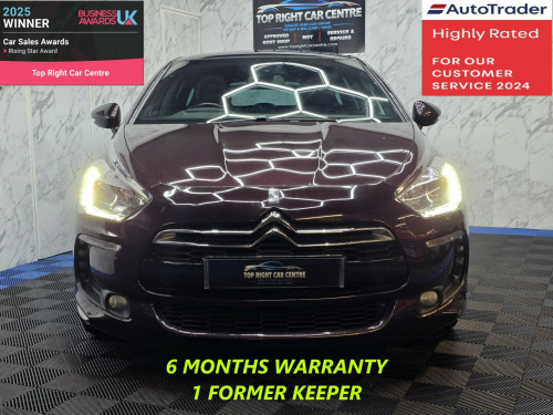 *** NIL DEPOSIT FINANCE AVAILABLE *** ***HPI CLEAR ***6 MONTHS WARRANTY AND BREAKDOWN COVER WITH THIS CAR.1 owner car.FULL SERVICE HISTORY. MOT 05 JULY 2026. Recently had full service done with rear brake disc pads replaced.This stunning Citroen DS5 has been sourced directly from its Previous Private Owner. Every now and again, a car comes into stock at Top Right Car Centre, that you cannot help but fall in love with.Top Spec DStyle has massive centre screen SATNAV, split panoramic roof, part leather interior, all electric windows, digital dual climate control, auto folding electric side mirrors, daytime running LED lights, privacy glass, parking sensors, cruise control. Clean Car in Purple colour. Great comfortable family car. Well maintained body work and interior. Bullet fast response. Checked by our engineers. Professionally detailed. Good reliable runner. Price checked. We've just completed a full pre delivery inspection on the car to give you complete piece of mind. 2 central locking keys. Smooth gear box. Clean glossy black alloy wheels. Excellent condition tyres. Multimedia has Bluetooth RADIO CD mp3. Run with no fault strong reliable engine. Good fuel economy. First to see will buy it this well looked after car. p/x welcome. We do price our cars/van as competitively as possible and because of this we sell cars/vans very quickly. BE QUICK! MISS IT - MISS OUT. With so much variety, quality and highly rated award winner 2024, it is no wonder we are super busy all the time. Why Buy From Top Right Car Centre?Thoroughly Inspected Cars. All our vehicles are quality-checked and HPi verified, giving you peace of mind with every purchase.Multi Award-Winning Family Business. As a trusted family-run business, we have earned awards for our customer service and expertise.Hand-Picked, Quality Cars. We carefully select only the finest cars with full service histories, so you can drive away with confidence.Test Driven for Assurance. Each car is personally test-driven by our team, ensuring it meets our high standards.Delivery Service available. v socket, auxiliary socket, connecting box - bluetooth system, radio - dab, radio - rds with cd and mp3 player, speakers x6, surround sound, usb socket, emyway - colour satellite navigation, etouch emergency and assistance system, 18in alloy wheels - grey canaveral, acoustic laminated front windows, body colour door handles, body coloured door mirrors, chrome sabres, dark tinted - rear side and tailgate windows, door mirrors - electrically adjustable/heated/folding/integrated kerb side led, electric windows - front and rear with one touch operation and anti pinch, locking wheel nuts, puncture repair kit, side rubbing strips - chrome, abs - anti-lock braking system, airbags - curtain front and rear, airbags - driver, airbags - front passenger with cut-off device, anti misfuelling device, anti-theft alarm - parametric and volumetric, automatic activation of hazard warning lights, automatic door and boot locking when in motion, child lock control and indicator, cornering stability control, deadlocks, eba - electronic brake assistance, ebfd - electronic brakeforce distribution, esp - electronic stability programme, electric parking brake, front lateral airbags, hill start assist, isofix - child seat anchorage points - outer rear, keyless access and start, multifunction plip remote control central locking, seat belt unfastened warning, traction control, air conditioning - automatic-digital with dual zone temperature setting, armrest - front with storage, armrest - rear with ski flap, auto-dimming electrochrome rear view mirror, automatic fuel cap, cockpit roof with toggle switches and 3-part glass roof with electric sunblinds, colour instrument panel, courtesy reading lights - front and rear, cup holder in rear centre armrest, door sill protector - front and rear, front and rear door pockets, height and reach adjustable steering wheel, live traffic information and european mapping, luggage compartment - lighting, pollen filter, rain sensing automatic front windscreen wipers, seats - 1-3 - 2-3 split folding rear, seats - drivers lumbar adjustment, seats - height adjustable front, steering wheel - leather with chrome effect inserts, steering wheel - multifunction, storage - front door pockets, storage - front seat back pockets, two sunglasses holders in cockpit roof, analogue clock, cruise control with speed limiter and memory settings, gei - gear efficiency indicator, multi-function on-board trip computer, rear parking sensors, reversing camera, variable power assisted steering, front fog lights, guide me home headlights function, headlights - automatic, headlights - halogen, headlights - height adjustable, led daytime running lights - drls