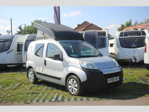 HY09AXP (2009) Citroën Nimo 610 LX 1.4 HDI R10 Solo Camper Van Excellent condition Citroën Nimo 610 LX (top spec) R10 Solo Camper Van by Romahome, 1 berth 2 seat belts, 1.4 HDI turbo diesel engine, Automatic gearbox, Pop top, Sink, 2 x gas hobs, Tow bar included, 240 volt hook up, Leisure battery, Air conditioning, Very economical and easy to park. Before collection we will carry out an MOT, engine service and a habitation service it also comes with a 3 months warranty, Home delivery available, Part exchange welcome, We are based in Routh near Beverley HU17 9SL Adjustable Steering Column/Wheel, Air Bag Driver, Anti-Lock Brakes, Armrest, Bulkhead, Central Door Locking, Centre Console, Clock, Deadlocks, Doors, Electric Windows (Front), Head Restraints, Immobiliser, In Car Entertainment (Radio/CD/MP3), Mirrors External (Electric Heated/Foldin, Nearside Sliding Side Loading Door, Power Socket, Power-Assisted Steering, Rev Counter, Seat Belt Pre-Tensioners, Seat Height Adjustment, Seat Lumbar Support, Spare Wheel (Full Size), Steel Wheels, Third Brake Light, Tinted Glass, Trip Computer, Upholstery Cloth