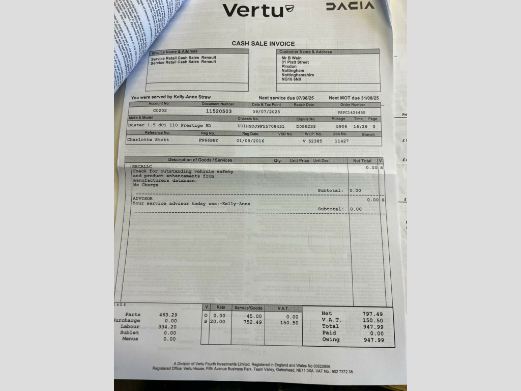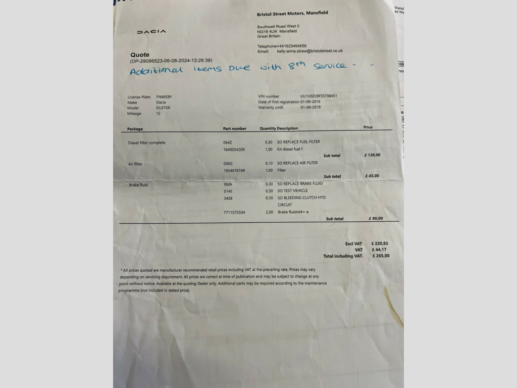 One Private Owner From New. This 2016 Dacia Duster dCi Prestige is a remarkable find, boasting an exceptionally low mileage of just 6020 miles from its single owner. This Euro 6 compliant 1.5L diesel engine is presented with a clear vehicle history check, offering peace of mind. Inside, you'll appreciate the manual air conditioning, Bluetooth connectivity, and the MediaNav 7in touchscreen multimedia system. Parking is made easier with rear parking sensors and a reverse parking camera.The Duster dCi Prestige stands out with its impressive fuel economy, achieving an outstanding 64 miles per gallon, which is significantly better than many other vehicles in its class. Furthermore, its low insurance group and low CO2 emissions contribute to lower running costs, making this a very economical choice. This combination of low mileage, single ownership, and excellent efficiency makes this Dacia Duster a truly compelling proposition.10 reasons to buy from us! 1. Small family run business with 100's positive reviews2.Finance available 3. Delivery Available 4. Warranty included - extended options available at cost price 5. We will be available at a time that suits you6. AA assured for added peace of mind 7. Over 45 years experience in the motor trade8. All of our cars come with a long MOT9. Part exchanges welcome at competitive prices 10 Good, old fashioned, friendly, caring service in alloy wheels - tyrol diamond cut, 3-point rear seatbelts x3, 3-speed front windscreen wipers, 4 x 20w fm-am-dab tuner with steering-column mounted fingertip controls, 7-function on-board computer, asr - traction control with esc - electronic stability control, aux input, air recirculation - 4-speed heating and ventilation, air vents - chrome surrounds, airbags - driver, airbags - front passenger with deactivation function, airbags - front side, anti-lock braking system - abs and emergency brake assist - eba, black number plate surround with satin chrome duster inscription, bluetooth connectivity, boot light, bumpers - front and rear lower section in black, bumpers - front and rear upper section - body coloured, central locking - remote, centre console fascia - matt black, centre console surround - dark carbon, child locks in rear doors, chrome front grille, cruise control and speed limiter, drl - daytime running lights, decorative inserts on front and rear door panels - piano black, door handles - body coloured, door mirrors - grey - dark metal, door mirrors - heated and electrically adjustable, door open - visual and audible warning, driver and passenger seatbelt not fastened - visual and audible warning, eco mode, electric windows - front, electric windows - rear, fabric decorative insert on front and rear door panels, front door sill protection strip, front fog lights, front passenger reading light, front seatbelt pretensioners, gear lever cap insert - satin chrome, gear shift indicator, glovebox light, headlights - double optic, headrests - rear height adjustable x3, heated rear window, height-adjustable drivers seat, height-adjustable front headrests, height-adjustable front seatbelts, height-adjustable steering wheel, high level third brake light, isofix points for child seats in both outer rear seats, instrument dial surrounds - satin chrome, interior door handles - satin chrome, lower steering wheel insert - satin chrome, manual air conditioning, map pockets on front seatbacks, medianav 7in touchscreen multimedia system, power assisted steering, rear parking sensors, rear passenger reading light, rear washer-wipe, rev counter, reverse parking camera, roof bars - longitudinal with duster inscription - satin chrome, seats - 60-40 split folding rear, side sills - satin chrome, skid plates - front and rear - satin chrome, steering wheel - chrome logo surround, steering wheel - leather, sunvisor with vanity mirror - passenger, tailgate trim with duster inscription - black-satin chrome, thatcham approved engine immobiliser, tinted windows, tyre inflation kit, tyre pressure monitor, usb connection for mp3 players, wheel arch mouldings, emergency spare wheel