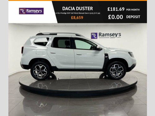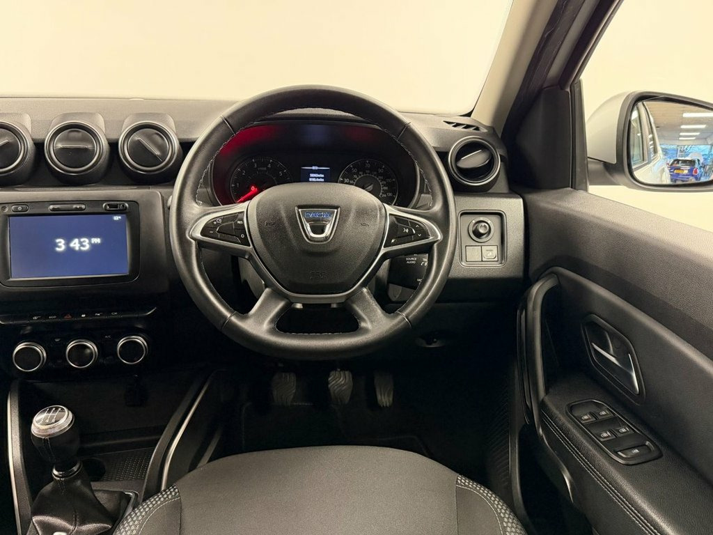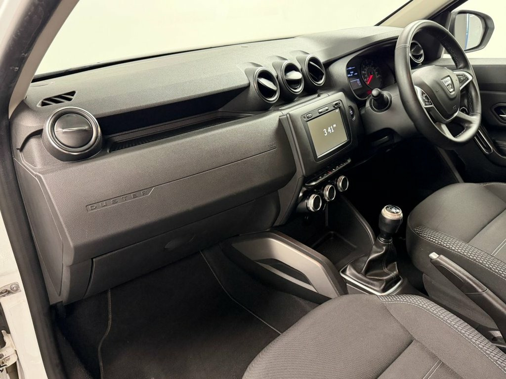 Dacia Duster 1.6 SCe Prestige SUV 5dr | Petrol | Manual | 115 PS | Euro 6 (s/s) | ULEZ Compliant Engine: 1.6L SCe Petrol Power: 115 PS Transmission: 5-Speed Manual Fuel Type: Petrol Emissions Standard: Euro 6 (s/s) – ULEZ Compliant Drive Type: Front-Wheel Drive (check if AWD for specific vehicle) The Dacia Duster Prestige offers excellent value for money with rugged SUV styling, practical interior space, and a generous level of equipment. A reliable and efficient choice for everyday use or outdoor adventures. Key Features: 7" touchscreen with satellite navigation Rear parking camera and sensors Cruise control with speed limiter Climate control Keyless entry and start 17" alloy wheels Roof bars Electric front and rear windows ISOFIX mounting points Euro 6 – ULEZ compliant Vehicle Details: Registration: YM19BJZ Year: 2019 Mileage: 58892 Colour: WHITE Location: CO. DURHAM. ONLY 5 MINS FROM THE A1 Before any car leaves our showroom, it's thoroughly inspected, serviced, and tested by our expert technicians. We check all major systems, replace worn parts, and carry out a final road test to ensure reliability and safety. Each vehicle is then professionally cleaned and detailed, with all paperwork and history verified. All of our vehicles are delivered with a 12 month MOT along with a minimum 6 month warranty to ensure pure peace of mind. Checked. Cleaned. Certified. Ready to drive with confidence. Contact our sales team on 01325300200 or 17in Alloy Wheels - Diamond-Cut, 3-Point Rear Seatbelts x3, 3-Speed Front Windscreen Wipers, 4 X 20W FM-AM-DAB Tuner with Steering-Co, 7-Function On-Board Computer, Air Recirculation - 4-speed Heating and , Air Vents - Satin Chrome, Airbags - Driver, Airbags - Front Passenger with Deactivat, Airbags - Front Side, Anti-lock Braking System - ABS and Emerg, Armrest - Front Centre, ASR - Traction Control with ESC - Electr, AUX Input, Black Number Plate Surround with Satin C, Blind Spot Warning, Bluetooth Connectivity, Boot Light, Bumpers - Front and Rear Lower Section i, Bumpers - Front and Rear Upper Section -, Central Locking - Remote, Centre Console Fascia - Matt Black, Centre Console Surroun