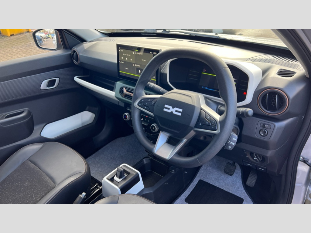 Dacia Spring 27kWh Extreme 65 48kW 5dr Auto Cruise control + speed limiter, Driver attention warning, e-Call (emergency call), Electric power assisted steering, Emergency Stop Signal (ESS), Event data recorder, Front and rear parking sensors, Lane departure warning system, Lane keep assist system, Rear camera, Rescue code, Traffic sign recognition with speed alert/Intelligent speed assist (ISA), DC Charger, Mode 3 charging cable, 10" MediaNav live, DAB radio, smartphone replication, bluetooth, 2 speakers, apple carplay, android auto, USB-C, USB socket, 3 speed windscreen wipers, Automatic headlights, Automatic wipers, Body colour door handles, Copper door mirrors, Electric adjustable/heated door mirrors, Electric rear windows, Front and rear Bumper, body coloured with black elements and decorative insert, Front electric windows, Heated rear window, High level third rear brake light, LED automatic daytime running lights, LED Y shape Dacia signature lighting, Rain sensor, Rear fog lights, Rear side wing doors, Rear wash wiper, Tinted windows, 1 piece folding rear bench seat back, 12V socket in front, Door sill protection with topographic pattern, Fabric/TEP upholstery, Front headrests, Grey interior door handles, Height adjustable steering wheel, ISOFIX attachment on outer rear seats, Manual air conditioning, Rear headrests, Rubber floor mats with topographic pattern, Single front passenger seat, Soft feel steering wheel, 6 airbags - Driver, front passenger, curtain and side airbags, ABS+EBA, Alcohol imoboliser predisposal, Automatic Emergency Braking System (AEBS), Child locks on rear doors, Door open visual and audible warning, Driver and passenger seatbelt not fastened warning, ESP + Hill Start Assist, Front seatbelt pretensioners, Side impact protection, Two 3 point rear seatbelts, Tyre pressure monitor, Engine immobiliser, Remote central locking, Copper airvents inserts, Khaki dashboard decopart, 15" steel wheels, Danube styler cover for 15" steel wheels, Tyre inflation kit