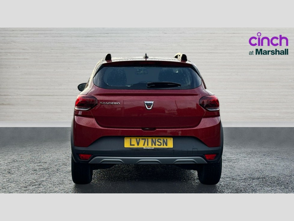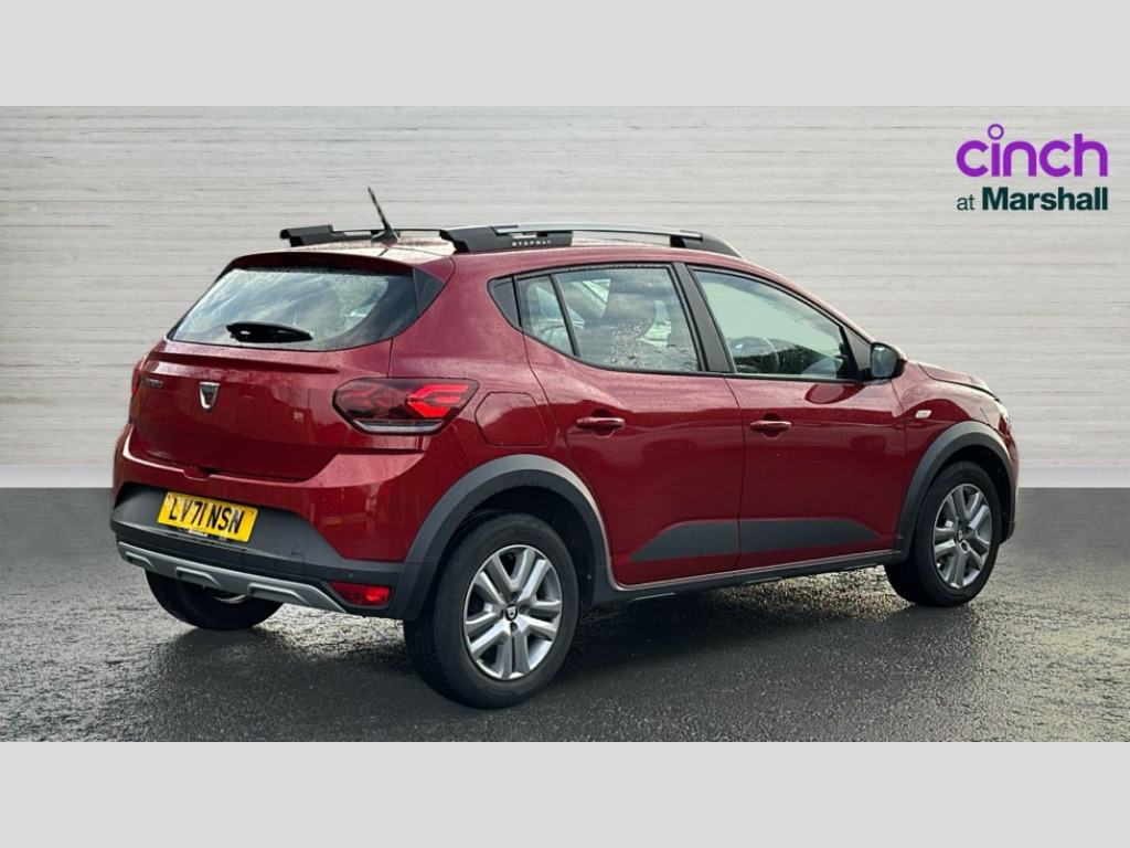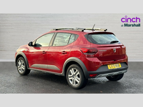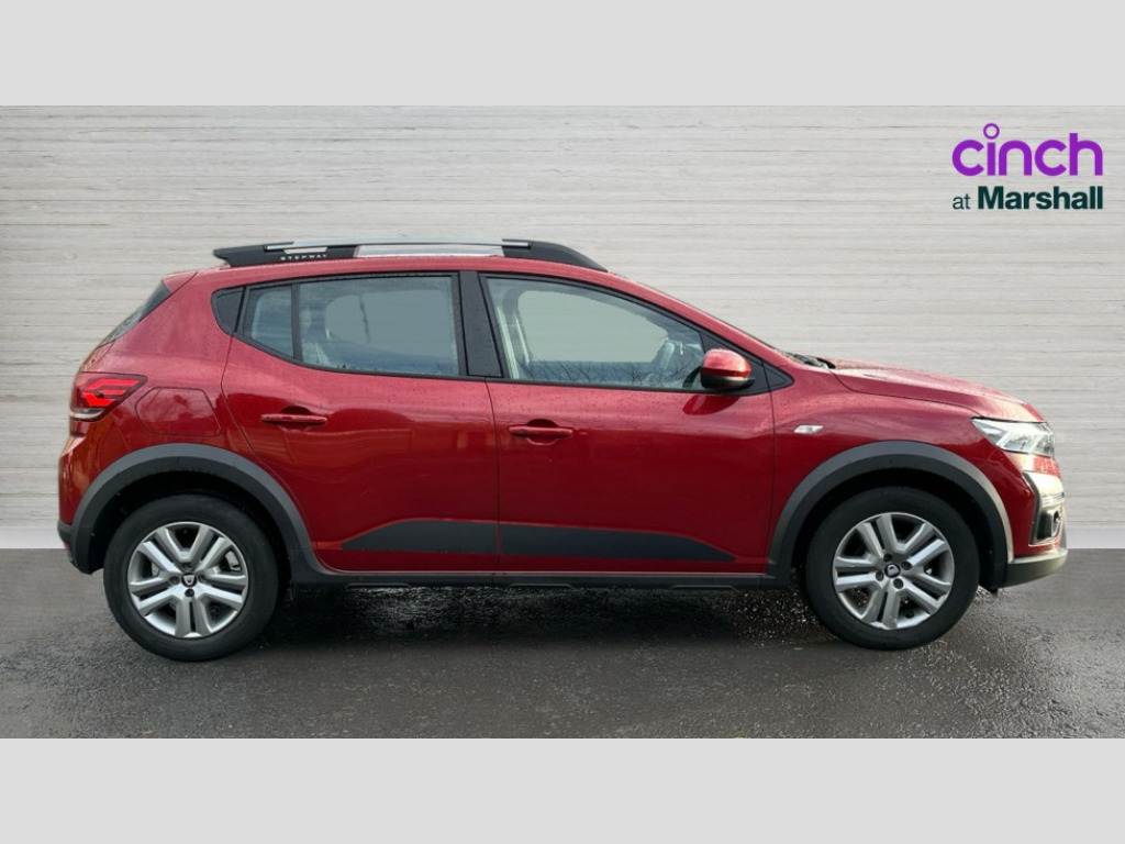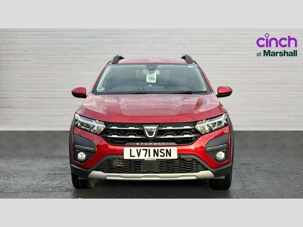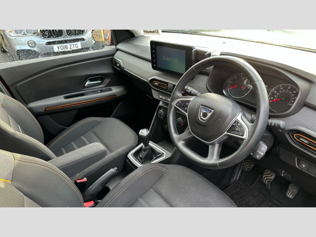 Dacia Sandero Stepway 1.0 TCe Comfort 5dr 3.5" TFT instrument panel with on-board computer, Cruise control with speed limiter, eCall emergency call system, Eco mode, Electric power assisted steering, Rear parking sensors, Rev counter, Reversing camera, Stop/start system, 8" Media display - DAB radio, smartphone replication, bluetooth, 4 speakers, Apple CarPlay and Android Auto, USB connection for data transfer and charging, USB socket, 3 speed windscreen wipers, Auto lighting, Automatic wipers, Body colour door handles, Body colour door mirrors, Body coloured bumpers, Chrome longitudinal roof bars, Chrome radiator grille, Electrically adjustable and heated door mirrors, Front fog lights, Heated rear window, High level third brake light, LED automatic daytime running lights, LED Y-shape Dacia signature lighting, Modular roof bars, One touch electric front windows, Rear electric windows, Rear wash/wipe, Stepway inscription on radiator grille and roof bars, Tinted windows, 1/3 to 2/3 split folding rear seats, 12 volt front socket, 12 volt rear socket, 3 height adjustable rear headrests, Driver + passenger vanity mirrors, Fabric upholstery, Fixed smartphone holder on dashboard, Front armrest, Gear shift indicator, Height adjustable driver seat, Height adjustable front headrests, Height/depth adjustable steering wheel, Isofix points for child seats in both outer rear seats, Manual air conditioning, Satin chrome interior door handles, Satin Chrome/Copper orange air vents, Soft feel steering wheel, Steering wheel controls, 3x3 point rear seatbelts, ABS and Emergency brake assist, Automatic emergency braking system, Child locks on rear doors, Door open warning, Driver airbag, ESC (Electronic Stability Control), ESP + Hill Start Assist, Front curtain airbags, Front seatbelt pretensioners, Front side airbags, Height adjustable front seatbelts, Passenger airbag, Seatbelt reminder for driver and front passenger, Tyre pressure monitor, Automatic central locking, Immobiliser, Keyless entry, Remote central locking, Decopart on instrument panel and door with textile, 16" Flex wheels with full wheel cap