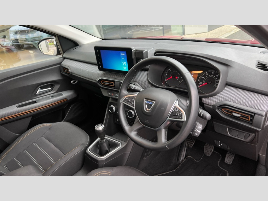 Dacia Sandero Stepway 1.0 TCe Prestige 5dr 3.5" TFT instrument panel with on-board computer, Blind spot warning, Cruise control with speed limiter, eCall emergency call system, Eco mode, Electric power assisted steering, Front parking sensors, Rear parking sensors, Rev counter, Reversing camera, Stop/start system, 8" MediaNav - DAB Radio, Wifi smartphone replication, Bluetooth, 6 speakres, Apple CarPlay and Android Auto, USB connection for data transfer and charging, USB socket, 3 speed windscreen wipers, Auto lighting, Automatic wipers, Body colour door handles, Body colour door mirrors, Body coloured bumpers, Chrome longitudinal roof bars, Chrome radiator grille, Electrically adjustable and heated door mirrors, Front fog lights, Heated rear window, High level third brake light, LED automatic daytime running lights, LED Y-shape Dacia signature lighting, Modular roof bars, One touch electric front windows, Rear electric windows, Rear wash/wipe, Stepway inscription on radiator grille and roof bars, Tinted windows, 1/3 to 2/3 split folding rear seats, 12 volt front socket, 12 volt rear socket, 3 height adjustable rear headrests, Automatic air conditioning, Driver + passenger vanity mirrors, Fabric upholstery, Fixed smartphone holder on dashboard, Gear shift indicator, Height adjustable driver seat, Height adjustable front headrests, Height/depth adjustable steering wheel, High central armrest with console storage, Isofix points for child seats in both outer rear seats, Satin chrome interior door handles, Satin Chrome/Copper orange air vents, Soft feel steering wheel, Steering wheel controls, 3x3 point rear seatbelts, ABS and Emergency brake assist, Automatic emergency braking system, Child locks on rear doors, Door open warning, Driver airbag, Electronic parking brake, ESC (Electronic Stability Control), ESP + Hill Start Assist, Front curtain airbags, Front seatbelt pretensioners, Front side airbags, Height adjustable front seatbelts, Passenger airbag, Seatbelt reminder for driver and front passenger, Tyre pressure monitor, Automatic central locking, Immobiliser, Keyless entry, Remote central locking, Decopart on instrument panel and door with textile, 16" Diamond-effect alloy wheels
