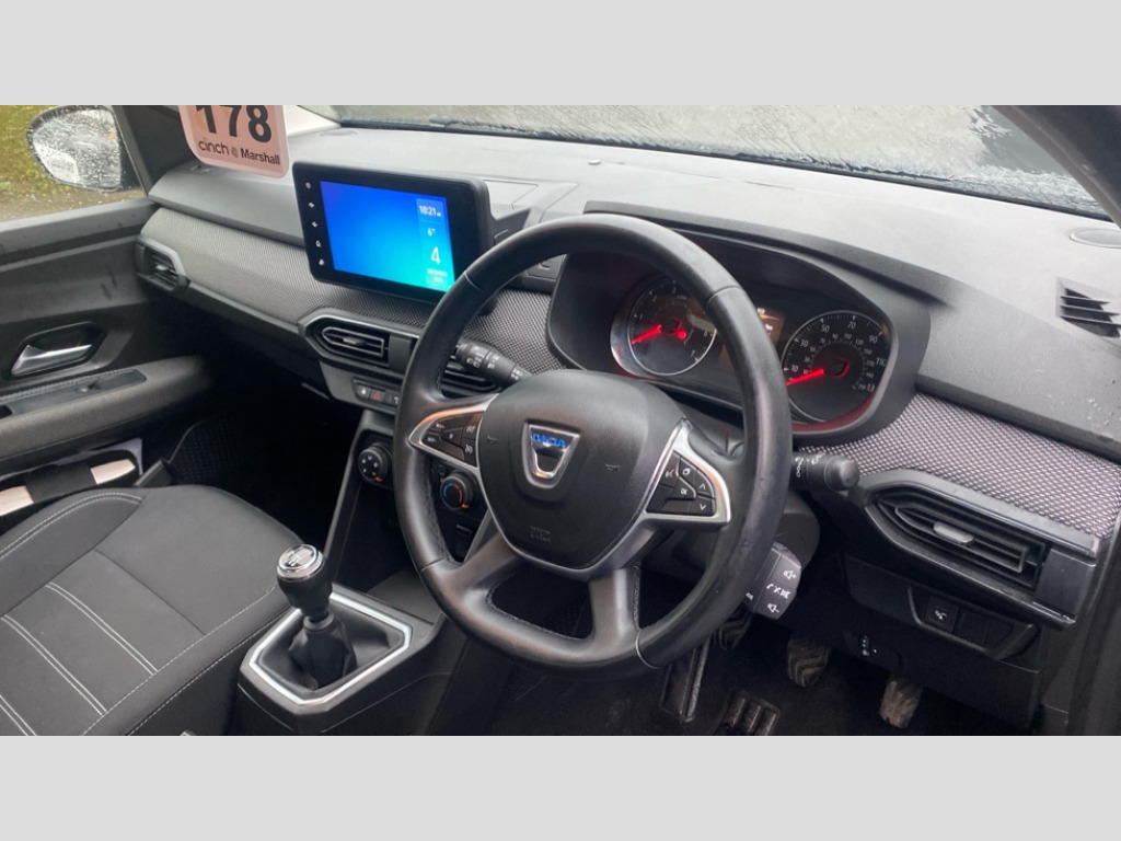 Dacia Sandero 1.0 TCe Comfort 5dr 3.5" TFT instrument panel with on-board computer, Cruise control with speed limiter, eCall emergency call system, Eco mode, Electric power assisted steering, Rear parking sensors, Rev counter, Reversing camera, Stop/start system, 8" Media display - DAB radio, smartphone replication, bluetooth, 4 speakers, Apple CarPlay and Android Auto, Pre-wiring for radio and speakers, USB connection for data transfer and charging, USB socket, 3 speed windscreen wipers, Auto lighting, Automatic wipers, Black radiator grille, Body colour door handles, Body colour door mirrors, Body coloured bumpers, Electrically adjustable and heated door mirrors, Front fog lights, Heated rear window, High level third brake light, LED automatic daytime running lights, LED Y shape Dacia signature lighting, One touch electric front windows, Rain sensor, Rear electric windows, Rear side wing doors, Rear wash/wipe, Tinted windows, 1/3 to 2/3 split folding rear seats, 12 volt front socket, 12 volt rear socket, 3 height adjustable rear headrests, 3 seat rear bench, Double satin chrome air vents, Driver + passenger vanity mirrors, Fabric upholstery, Fixed smartphone holder on dashboard, Front armrest, Gear shift indicator, Height adjustable driver seat, Height adjustable front headrests, Height/depth adjustable steering wheel, Isofix points for child seats in both outer rear seats, Manual air conditioning, Satin chrome interior door handles, Single front passenger seat, Soft feel steering wheel, Steering wheel controls, 3x3 point rear seatbelts, ABS and Emergency brake assist, Automatic emergency braking system, Child locks on rear doors, Door open warning, Driver airbag, ESC (Electronic Stability Control), ESP (Electronic Stability Program) + Hill Start Assist, Front curtain airbags, Front seatbelt pretensioners, Front side airbags, Height adjustable front seatbelts, Passenger airbag, Seatbelt reminder for driver and front passenger, Tyre pressure monitor, Automatic central locking, Immobiliser, Keyless entry, Remote central locking, Decopart on instrument panel and door with textile, 15" Flex wheels with full wheel cap