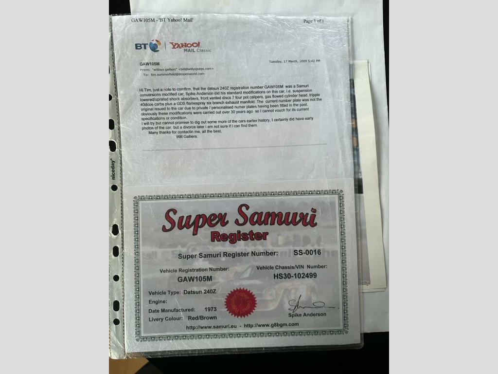One such was Spike Anderson. Having trained at Broadspeed in the 1960s working on Minis and Anglias, he went on to set up his own business called Race Head Services, and one of the first cars to benefit from his experience was a humble Datsun 1200 from which he managed to extract 105bhp! This was the first car to carry the Samuri name, a deliberate mis-spelling as the 'Samurai' trade name was not available. Having bought a standard 240Z, it wasn't long before it was taken apart and put together faster - very much faster. A UK-car magazine published a glowing review of Spike's personal car, and the next thing he knew, the Samuri Motor Company was born, offering modified Zs and performance parts to the buying public. This genuine certified and documented right hand drive UK supplied Samuri that is well known in Samuri circles. Number 16 of the 177 produced during the 1970s that is only available as our client had seen and admired it at shows and events and was privileged to be offered the car from the family of the owner Peter’s estate when he sadly passed away three years ago. Peter and his wife were regulars at the Samuri events and he owned the car for some 12 years restoring it when he first purchased. Now an older restoration which still presents really very well today, our clients brother lived in the neighbouring village to Peter and would often stop, admire and chat with Peter about his Samuri it was therefore an opportunity our client jumped at to own this fantastic example when it became available.