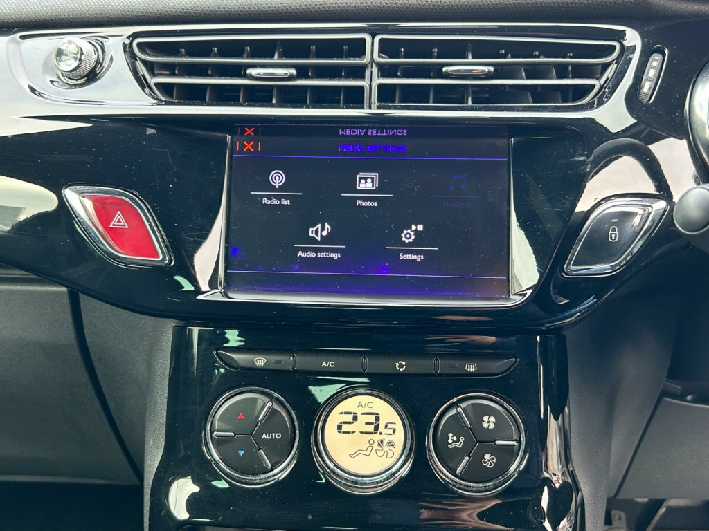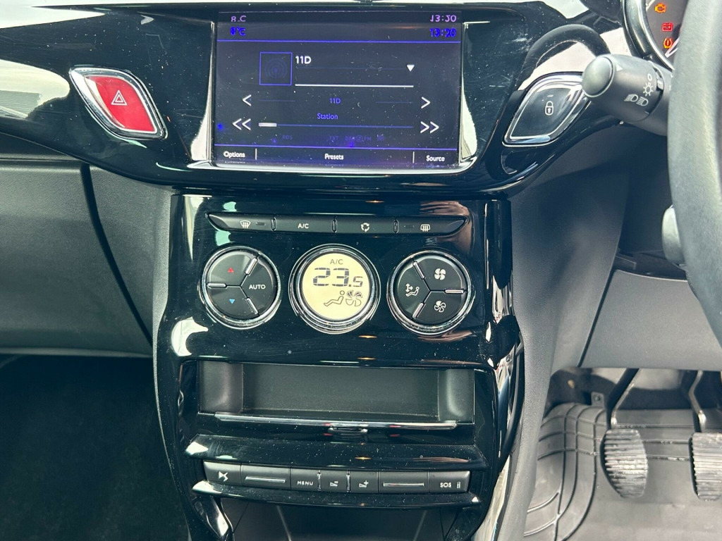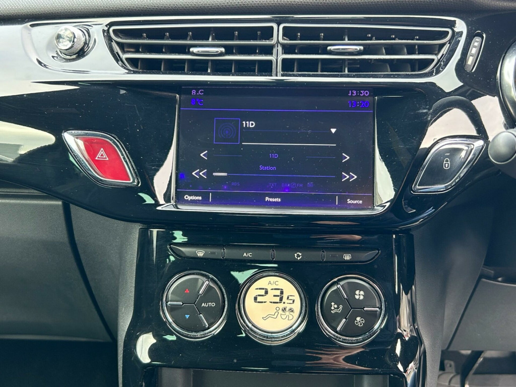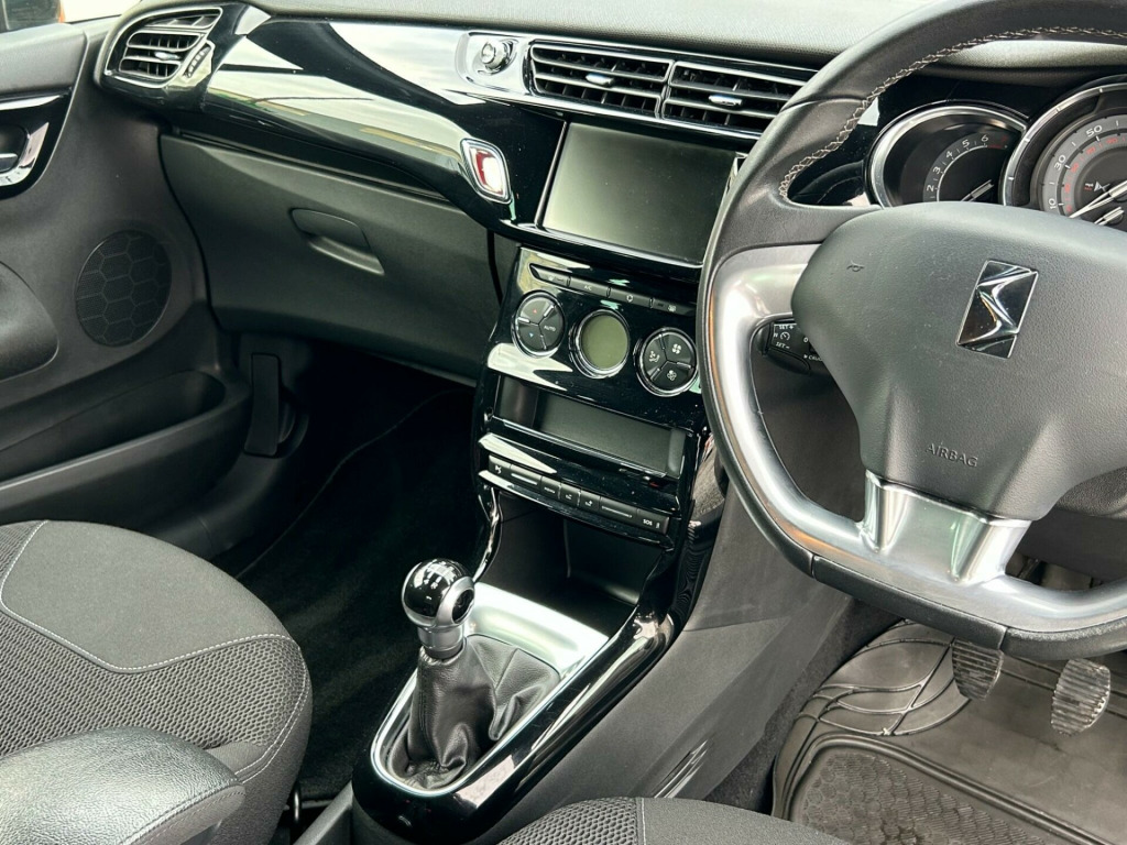 Finished In Black This 2018 DS3 PureTech Connected Chic is a stylish and well equipped hatchback. It features a 1.2 litre petrol engine and meets Euro 6 emission standards. Inside, you'll find automatic air conditioning with climate control, ensuring a comfortable cabin temperature. The Mirror Screen system, compatible with Mirror Link, Android Auto, and Apple CarPlay, allows seamless integration of your smartphone for navigation and entertainment. Bluetooth handsfree and media streaming, along with a 1A USB socket, further enhance connectivity.This DS 3 offers excellent running costs, achieving an impressive 61 miles per gallon. Its low CO2 emissions also mean it is more environmentally friendly than many comparable vehicles. These highlights demonstrate its efficiency and advanced technology, making it a smart choice for your next car., volt socket in cabin, 17in alloy wheels - aphrodite black diamond-cut, 3d led rear lights, 7in touchscreen, abs - anti-lock braking system with electronic brakeforce distribution and emergency braking assistance, alarm, automatic air conditioning, black panel on-off instrument lighting, bluetooth handsfree and media streaming with 1a usb socket, boot lighting, chrome ds wings grille, chrome door handles, chrome rear bumper insert, chrome side rubbing strips, coloured plip key insert, compressor with puncture repair kit, cruise control with speed limiter, dab digital radio, ds connect box emergency and assistance system, dark tinted rear windows, driver-front passenger-front lateral and curtain airbags, drivers unfastened seat belt warning, drivers and passengers sunvisor with courtesy mirror, esc - electronic stability control, electrically adjustable door mirrors, exterior temperature display, five 3-point inertia reel seat belts, front armrest, front courtesy and reading lights, front door pockets with bottle holder, front electric windows, front seat back pockets, front seat belt pretensioners, gei - gear efficiency indicator, gloss black centre console and interior door handle surrounds, gloss black gear knob, height and reach adjustable steering wheel, height-adjustable drivers seat, height-adjustable halogen headlights, immobiliser, integrated air freshener, interior mood lighting, led daytime running lights, led front fog lights, lashing eyes in the boot, leather handbrake with chrome insert, leather steering wheel, locking wheel bolts, mirror screen with mirror link and car play, multi-function on-board trip computer, rds radio with 6 speakers and aux socket, rear split-folding seats, remote central control locking with deadlocks, rev counter, roof colour painted door mirrors, satin chrome door sill protectors, satin chrome steering wheel inserts, single chrome exhaust tailpipe, soft-touch upper dashboard, sport suspension, steering wheel mounted controls, tungsten dashboard strip, two rear isofix mounting points, tyre pressure monitor, variable-assistance power steering, emyway satellite navigation