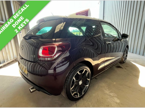 HAVE YOU READ OUR REVIEWS? PLEASE DO! NOTE- SIMILAR VEHICLES IN STOCK. AIRBAG RECALL DONE! THIS DS3 IS IN A DESIRABLE COLOUR WITH LOW MILES FOR THE AGE- 68K. WOULD MAKE A GREAT FIRST TIME CAR WITH ITS LOW RUNNING AND INSURANCE COSTS. SUPPLIED WITH A LONG MOT 04/26 AND SERVICE HISTORY ATTACHED WITH 8 STAMPS- LAST DONE IN OUR WORKSHOP AT 68K. EVIDENCE OF THE TIMING BELT CHANGED! MANY EXTRAS INCLUDING A ELECTRIC WINDOWS, AUX, USB, BLUETOOTH, MIRROR SCREEN, APPLE CAR PLAY, DAB RADIO AND CRUISE CONTROL. COMES WITH 2 KEYS. ONLY £20 ANNUAL TAX! ALSO- ALL OF OUR VEHICLES COME WITH A 12 MONTH AA BREAKDOWN COVER AND 3 MONTHS WARRANTY (RESTRICTIONS APPLY). PLEASE NOTE- The ABOVE VEHICLE SPECIFICATION IS CONFRIMED AND CORRECT. THE SPECIFICATION LISTED ELSEWHERE MAY SOMETIMES BE INACCURATE SO PLEASE CHECK WITH THE SALES EXECUTIVE WHEN ENQUIRING TO CLARIFY THIS PRIOR TO PURCHASE. Whisper Purple, Roof Colour - Polar White, 12v Socket - Front, 17in Alloy Wheels - Bellone Black, 3D LED Rear Lights, 7in Touchscreen, ABS - Anti-lock Braking System, Air Conditioning, Airbags - Curtain, Airbags - Driver, Airbags - Front Lateral, Airbags - Front Passenger, Auxilary Socket, Black Panel Night-time Instrument Lighti, Bluetooth Handsfree, Bluetooth Media Streaming, Boot Lighting, Bottle Holder, Chrome Door Handles, Chrome Effect Gear Surround, Chrome Front Fog Light Surrounds, Chrome Front Grille Surround, Chrome Rear Bumper Insert, Chrome Side Rubbing Strips, Compressor with Puncture Repair Kit, Cruise Control with Speed Limiter, DAB Digital Radio, Dark Tinted Rear Windows, Doo