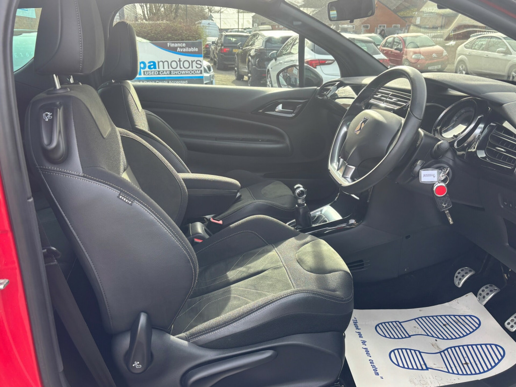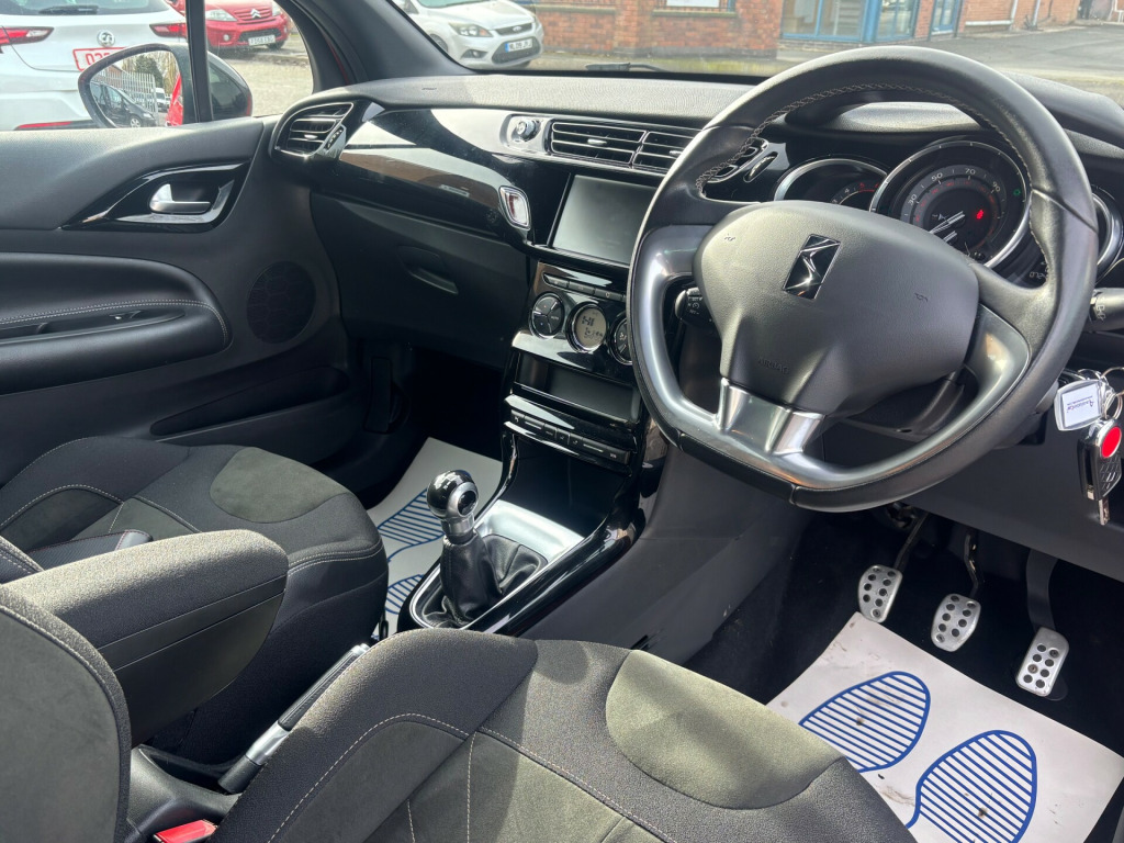 volt socket in cabin, 7in touchscreen, bluetooth handsfree and media streaming with 1a usb socket, dab digital radio, ds connect box emergency and assistance system, mirror screen with mirror link and car play, rds radio with 6 speakers and aux socket, 3d led rear lights, height-adjustable halogen headlights, led daytime running lights, led front fog lights, abs - anti-lock braking system with electronic brakeforce distribution and emergency braking assistance, alarm, coloured plip key insert, driver-front passenger-front lateral and curtain airbags, drivers unfastened seat belt warning, esc - electronic stability control, five 3-point inertia reel seat belts, front seat belt pretensioners, hill start assist, immobiliser, remote central control locking with deadlocks, two rear isofix mounting points, aluminium sports pedals, automatic air conditioning, black panel on-off instrument lighting, boot lighting, drivers and passengers sunvisor with courtesy mirror, front courtesy and reading lights, front door pockets with bottle holder, front seat back pockets, gloss black centre console and interior door handle surrounds, gloss black gear knob, gloss black kit - gloss black dashboard strip, height and reach adjustable steering wheel, height-adjustable drivers seat, height-adjustable front passenger seat, integrated air freshener, interior mood lighting, lashing eyes in the boot, leather handbrake with chrome insert, leather steering wheel, rear split-folding seats, satin chrome door sill protectors, satin chrome gear surround, satin chrome steering wheel inserts, soft-touch upper dashboard, sports seats, steering wheel mounted controls, chrome ds wings grille, chrome door handles, chrome front fog light surrounds, chrome rear bumper insert, chrome side rubbing strips, compressor with puncture repair kit, dark tinted rear windows, electrically adjustable door mirrors, front electric windows, locking wheel bolts, roof colour painted door mirrors, single chrome exhaust tailpipe, cruise control with speed limiter, exterior temperature display, gei - gear efficiency indicator, multi-function on-board trip computer, rear parking sensors, rev counter, sport suspension, tyre pressure monitor, variable-assistance power steering