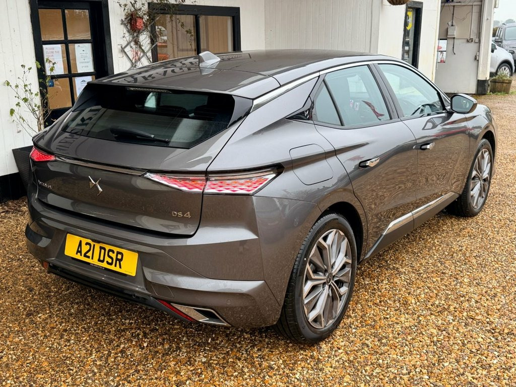 This 2023 DS 4 1.6 PHEV e-Tense Trocadero combines striking French design with the efficiency of a plug-in hybrid powertrain, offering a premium alternative in the compact car market. It delivers a refined driving experience with a high-tech interior and a substantial all-electric range perfect for daily commutes. The DS 4 Trocadero trim comes well-equipped, blending sophisticated style with modern technology and performance. The plug-in hybrid system integrates a 1.6-litre turbocharged petrol engine and a 110hp electric motor, producing a combined 225hp. This allows for a 0-62 mph time of 7.7 seconds and a top speed of 145 mph. Powered by a 12.4 kWh lithium-ion battery, the vehicle boasts an official all-electric range of up to 38 miles (WLTP combined cycle). This contributes to impressive fuel economy and low CO2 emissions (27g/km), making it an attractive option for company car drivers due to the low BIK tax liability. The cabin features a "Digital Seamless Cockpit" with multiple screens, including a 10-inch HD central touchscreen, a 7-inch digital instrument cluster, and a unique 5-inch 'DS Smart Touch' screen for customizable shortcuts. The Trocadero trim features 'Tungsten Diamond cloth' interior upholstery. Standard features include keyless entry and start, front and rear parking sensors, a 180-degree reversing camera, lane keep assist, intelligent speed adaptation, and automatic LED headlights and wipers. First registered as a pre-r Lacquered Grey, 1-3 - 2-3 Split Rear Bench Seat, 10in HD Touchscreen, 12V Socket - Luggage Compartment, 12v Socket - Front, 19in Alloy Wheels - Firenze Diamond-cut, 7in Digital Instrument Cluster, ABS - Anti-lock Braking System, Accelerated Charging Cable - Type 2, Acoustic Windscreen, Airbags - Curtain, Airbags - Curtain Rear, Airbags - Driver, Airbags - Front Lateral, Airbags - Front Passenger, Alarm - Perimetric and Volumetric, Automatic Door Locking While Driving, Automatic Front Windscreen Wipers, Automatic Welcome Lighting at Car Unlock, Bluetooth Handsfree and Media Streaming, Chrome DS Wings, Chrome Front Grille, Chrome Upper Window Surrounds, Cruise Control with Speed Limiter, DAB D