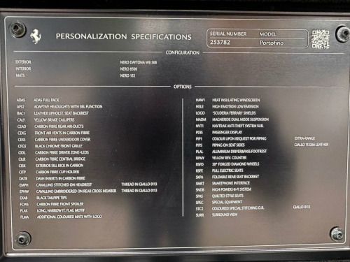 STUNNING HUGE £70,000 SPEC 2020 FERRARI PORTOFINO 590bhp IN NERO DAYTONA EXTERIOR PAINT OVER NERO NAPPA LEATHER INTERIOR WITH CONTRASTING GIALLO YELLOW STITCHING AND BRAKE CALIPERS. ULTRA LOW MILES.. SERVICED JUNE 2025 @FERRARI LEEDS AND 1 MORE SERVICE LEFT ON THE INCLUDED 7 YEAR SERVICE PLAN. FULL BRAND NEW SET OF MICHELIN PS4S TYRES ALL ROUND. FULL PPF. Complete with Ferrari Car Cover, Trickle charger and Wind deflector. HUGE £70K+ SPECIFICATION AS FOLLOWS £Full ADAS Package inc Adaptive Cruise control (very rare option) - £7,000.00 £Carbon Fibre Driver Zone and Steering Wheel with LEDs - £4320.00 £Carbon Fibre Cup Holder - £1440.00 £Front Grille with Black Chrome - £960.00 £Carbon Fibre Underdoor Cover - £4992.00 £Heat-Insulating Windscreen - £672.00 £Foot Rest in Aluminium - £480.00 £Colour Upon Request for Special Stitching - £432.00 £Leather Central Tunnel - £624.00 £Colour Upon Request for Seat Piping - £528.00 £Floor Mats with Embroidered Logo - £768.00 £Embroidered Prancing Horse on Headrests - £720.00 £Black Ceramic Exhaust Pipes - £960.00 £Carbon Fibre Front Spoiler - £3360.00 £Black External A Pillars - £768.00 £Carbon Fibre Front Airvents - £2400.00 £Exterior Sill Kick in Carbon Fibre - £1152.00 £Leather Lower Dashboard - £864.00 £S Squared Pattern Style Seats, Carbon Fibre Underdoor Cover, Anti Stone Chipping Protective Film, Scuderia Ferrari Shields on Fenders, Sport Exhaust Pipes, Giallo Modena Brake Callipers, Exterior Sill Kick in Carbon Fibre, Carbon Fibre Rear Air Ducts, Carbon Fibre Front Spoiler, Carbon Fibre Front Airvents, Black Ceramic Exhaust Pipes, 20in Alloy Wheels - Forged Diamond Rims, Yellow Rev Counter, Steering Wheel - Carbon Fibre with LEDs, Leather Lower Dashboard, Inner Colour Door Panel Trim, Foot Rest in Aluminium, Floor Mats with Embroidered Logo, Electrochromic Rearview Mirror, Colour Upon Request for Steering Wheel, Colour Upon Request for Seat Piping, Colour Upon Request for Special Stitchin