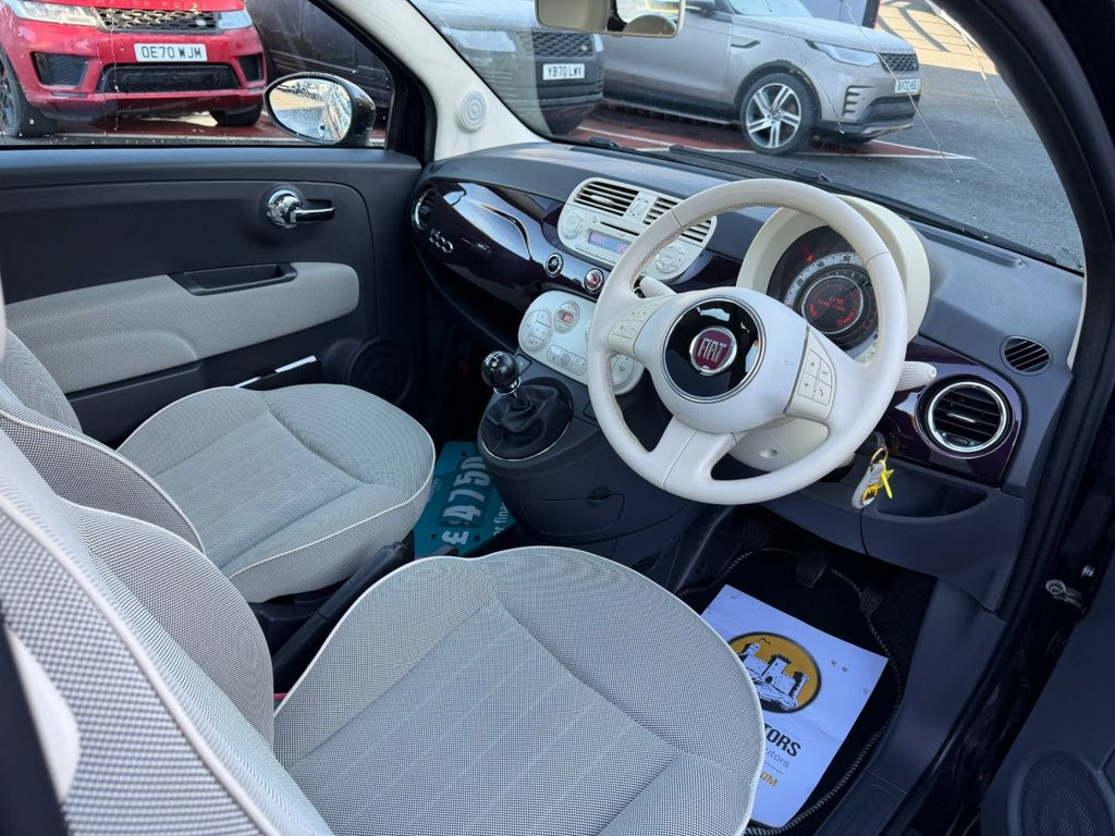 TwinAir 875. Chillout Purple Metallic with Black Chequered & Ivory Ambience interior, climate control AC, MP3 Stereo with Aux and USB Media, glass sunroof, multispoke alloys and more. Local car with only 67,350 miles, service history and freshly serviced before sale by ourselves. Must be seen 15in Alloy Wheels - 431, ABS - Anti-Lock Braking System, Airbags - Driver, Airbags - Front Side, Airbags - Passenger, Blue&Me - Hands Free System with USB, Body Coloured Bumpers, Body Coloured Door Mirrors, Bumpers - Chrome Inserts, Chillout Purple, Chrome Exhaust Tailpipe, Chrome Kit, Chrome Window Contours, Climate Control - Automatic Dual Zone, Cloth - Black Chequered with Ivory Ambie, Door Handles - Chrome, Drivers Knee Airbag, EBD - Electronic Brakeforce Distribution, Electric Front Windows, Electric Sunroof, Electrically Adjustable Heated Door Mirr, Exterior Temperature Sensor, Fixed Glass Roof with Sunblind, Head Restraints - Front Height Adjustmen, Headlights - Height Adjustable,