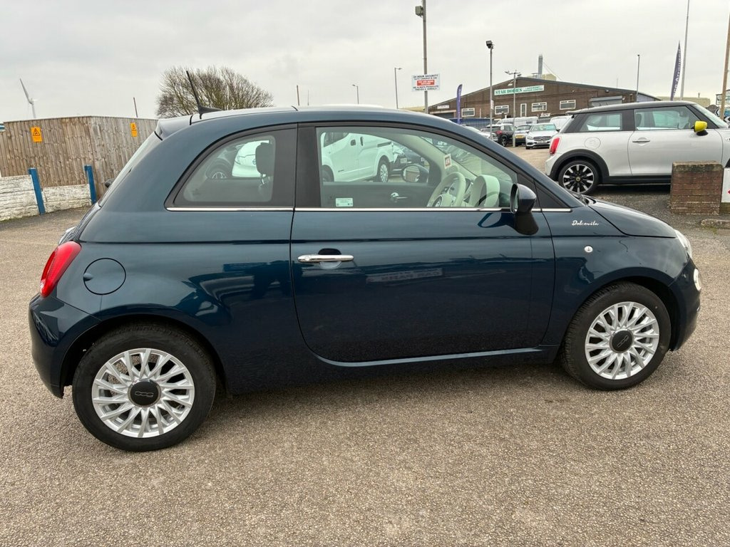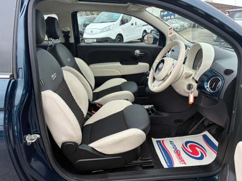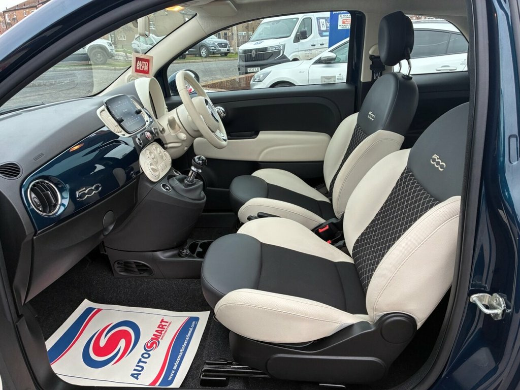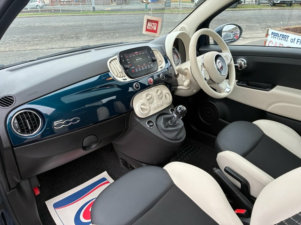 1 OWNER FROM NEW* 3 STAMP FIAT SERVICE HISTORY* PANORAMIC ROOF* PARKING SENSORS* PART LEATHER* CITY MODE* AUTO START / STOP* CRUISE CONTROL* BLUETOOTH PHONE AND AUDIO* DAB* USB* AIR CON* REMOTE CENTRAL LOCKING WITH 2 KEYS* ELECTRIC WINDOWS & MIRRORS* 15" ALLOYS* EPIC BLUE* SPLIT AND FOLD REAR SEATS* HEIGHT ADJUSTABLE DRIVERS SEAT 15in Alloy Wheels, 50-50 Split Folding Rear Seat with Heigh, 7 Airbags, 7in HD Touchscreen Radio with Bluetooth , ABS with EBD, Air Conditioning, Apple CarPlay - Android Auto Connectivit, Automatic Door Locking, Body Coloured Bumpers, Body Coloured Dashboard, Chrome Kit, Chrome Plated Exterior Door Handles, Cruise Control, Dolcevita Badge, Electric Front Windows, Electrically Adjustable and Heated Body , Epic Blue, ESC - Electronic Stability Control, Fabric - Black-Ivory with Ivory Ambience, Fix and Go Puncture Repair Kit, Fixed Sunroof, Fog Lights, Height Adjustable Drivers Seat, LED Daytime Running Lights, Rack and Pinion with Electric Power Stee, Rain and Dusk Sensors, Rear Parking Sensor