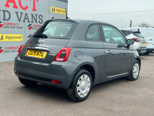 Compact Cars And Vans are delighted to present a superb example Fiat 500 with less than 9500 miles. The Fiat is powered by a popular 1.0 litre MHEV petrol engine boasting 57.7mpg on a combined cycle and is just £195 a year to tax! The 500 is a great choice for first time driver with this particular model benefiting from group 8 insurance. The Pop Hybrid model includes spec such as telephone connection, air conditioning and so much more. 14in Steel Wheels, 7 Airbags, ABS with EBD, Air Conditioning, Automatic Door Locking, Body Coloured Bumpers, Body Coloured Dashboard, Chrome Plated Exterior Door Handles, DAB Radio with USB, ESC - Electronic Stability Control, Electric Front Windows, Electrically Adjustable and Heated Body , Fix and Go Puncture Repair Kit, LED Daytime Running Lights, Rack and Pinion with Electric Power Stee, Remote Central Locking, Seats - Folding Rear Back, Speed Limiter, Steering Wheel - Height Adjustment, Steering Wheel Audio Controls, TPMS - Tyre Pressure Monitoring System, Fabric - Blue with Black Ambience, Tech House Grey