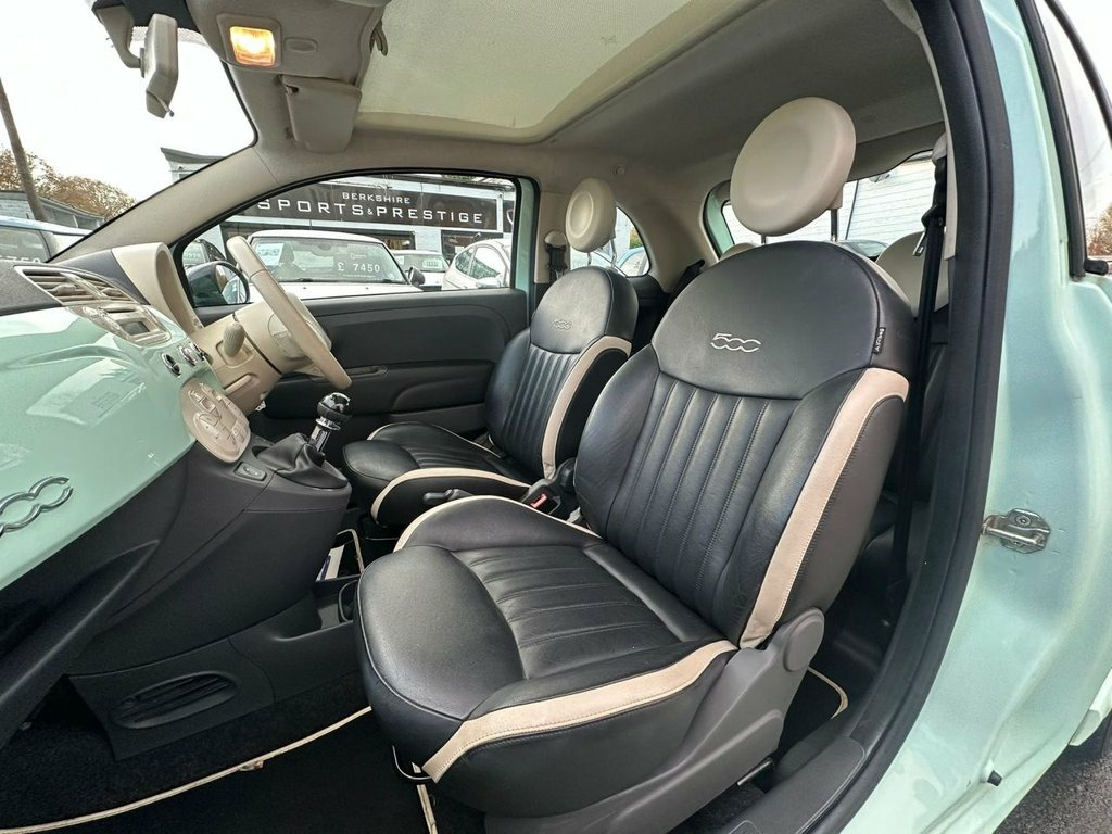 Berkshire sports and prestige are pleased to offer this 1 owner from new 2014/64 fiat 500 1. 2 CULT hatchback with a good spec and a service history , spec includes ,fixed panoramic roof smooth mint paintwork air con front fog lights electric door mirrors full size spare wheel , 16" silver alloy wheels privacy glass , full leather seats plus all the usual spec. please call or email to register interest .pictures to follow Fixed Glass Roof, Blue&Me - Hands Free System with USB, Smooth Mint, Leather - Black-Ivory with Ivory Ambienc, Body Coloured Side Rubbing Strips with 5, 16in Alloy Wheels - 74A, Rear Parking Sensors, Steering Wheel - Leather with Audio Cont, Steering Wheel Audio Controls, ABS - Anti-Lock Braking System, Airbags - Driver, Airbags - Front Side, Airbags - Passenger, ASR - Anti-Slip Regulation, BAS - Brake Assistance System, Body Coloured Bumpers, Chrome Kit, Climate Control - Automatic Monozone, Drivers Knee Airbag, Dualdrive Power Steering, EBD - Electronic Brakeforce Distribution, Electric Front Windows, Electrically Adjustable Heated Door Mirr, 12V Socket - Front, ESP - Electronic Stabil