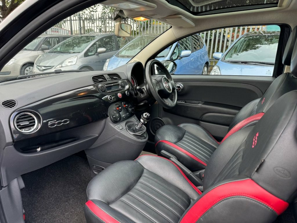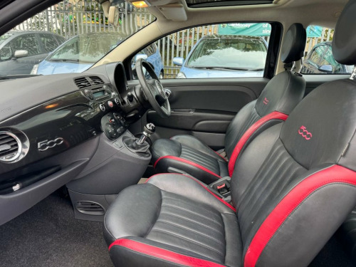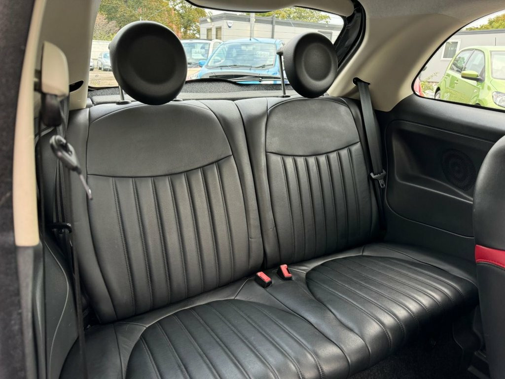 We have here a lovely example Fiat 500, finished in metallic black with black leather upholstery. Fitted with electric windows, CD player, city driving mode, 17" alloy wheels, climate control, bluetooth, digital speedo. Having covered only 31k miles from new with a full service history. 2 KEYS. 12V Socket - Front, Blue&Me - Hands Free System with USB, Dualdrive Power Steering, Radio-CD and MP3 Player, TFT Screen - Colour 7in, 16in Alloy Wheels - 74A, Body Coloured Bumpers, Chrome Kit, Electric Front Windows, Electrically Adjustable Heated Door Mirr, Fix and Go Puncture Repair Kit, Fixed Glass Roof, Locking Wheel Nuts, Roof - Black, Space Saver Spare Wheel, Thermal Windows, ABS - Anti-Lock Braking System, ASR - Anti-Slip Regulation, Airbags - Driver, Airbags - Front Side, Airbags - Passenger, BAS - Brake Assistance System, Drivers Knee Airbag, EBD - Electronic Brakeforce Distribution, ESP - Electronic Stability Programme, Exterior Temperature Sensor, GSI - Gear Shift Indicator,