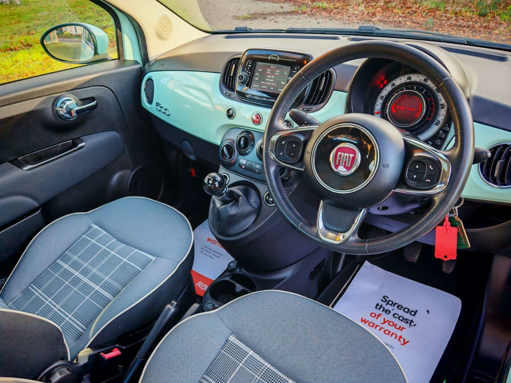 We have to offer a Fiat 500 1.2 Lounge in Mint Green presented in stunning condition. a credit to its previous owner who has maintained the vehicle to high standards. Full service history serviced every year, recently serviced with 12 mot inspection. Unmarked factory alloy wheels freshly. Upgrades include Panoramic roof, Cruise control, Rear parking sensors, U-connect, 50/50 split fold rear seat, Bluetooth system calls and audio. Part exchange and low rate finance arranged, please see Aminaautos.co.uk for options and apply directly via our website. The vehicle has also undergone a full valet and exterior polish in preparation for its new owner and is presented in stunning condition. Replacement keys can be expensive so all our vehicles come with 2 keys. All vehicles come with 3 month warranty as standard, we also offer extended warranties for longer periods. We are a family owned business with a true passion for cars and customer service. We go the extra mile for our customers presenting only the best vehicles, making the car buying experience easy. Low rate finance. Autotrader guaranteed part exchange valuations. Viewings by appointment please. 15in Alloy Wheels, 50-50 Split Folding Rear Seat with Height Adjustable Head Restraints, 5in Touchscreen Radio with AUX - USB - DAB - Bluetooth, 7 Airbags, ABS with EBD, Air Conditioning, Automatic Door Locking, Body Coloured Bumpers, Chrome Kit, Chrome Plated Exterior Door Handles, Cruise Control, Driver and Passenger Airbag with Dual Stage System, Dualdrive Power Steering, ESC - Electronic Stability Control, Electric Front Windows, Electrically Adjustable Painted Door Mirrors, Fix and Go Puncture Repair Kit, Fixed Glass Roof with Sunblind, Fog Lights, Front Seats with Memory Function, GSI - Gear Shift Indicator, Hazard Light Automatic Activation During Emergency Braking, Heat Reflective Windows, Heated Rear Window, Height Adjustable Drivers Seat, Height Adjustable Front Head Restraints, ISOFIX Attachment Points for Child Safety Seat On Rear Seat, Instrument Panel with Rev Counter, LED Daytime Running Lights, Rear Parking Sensors, Rear Window Wiper-Washer, Remote Central Locking, Seats-back Pockets, Speed Limiter, Steering Wheel - Height Adjustment, Steering Wheel - Leather with Audio Controls, TPMS - Tyre Pressure Monitoring System, Trip Computer, Cloth - Black-Light Grey-Ivory with Black Ambience. Full service history