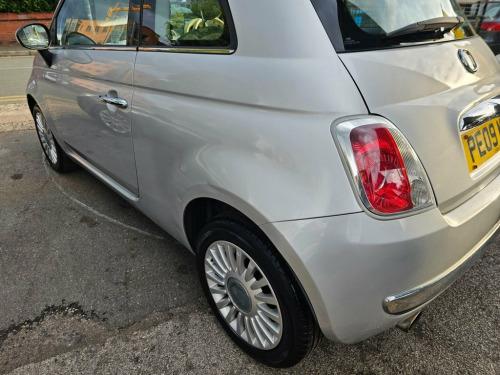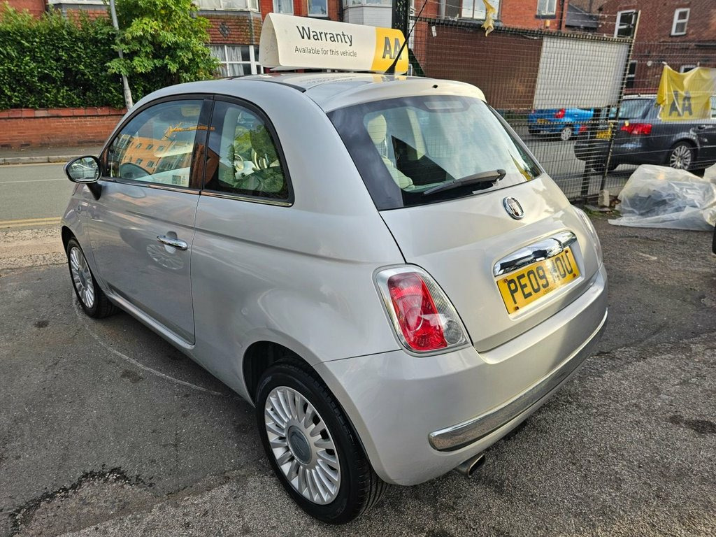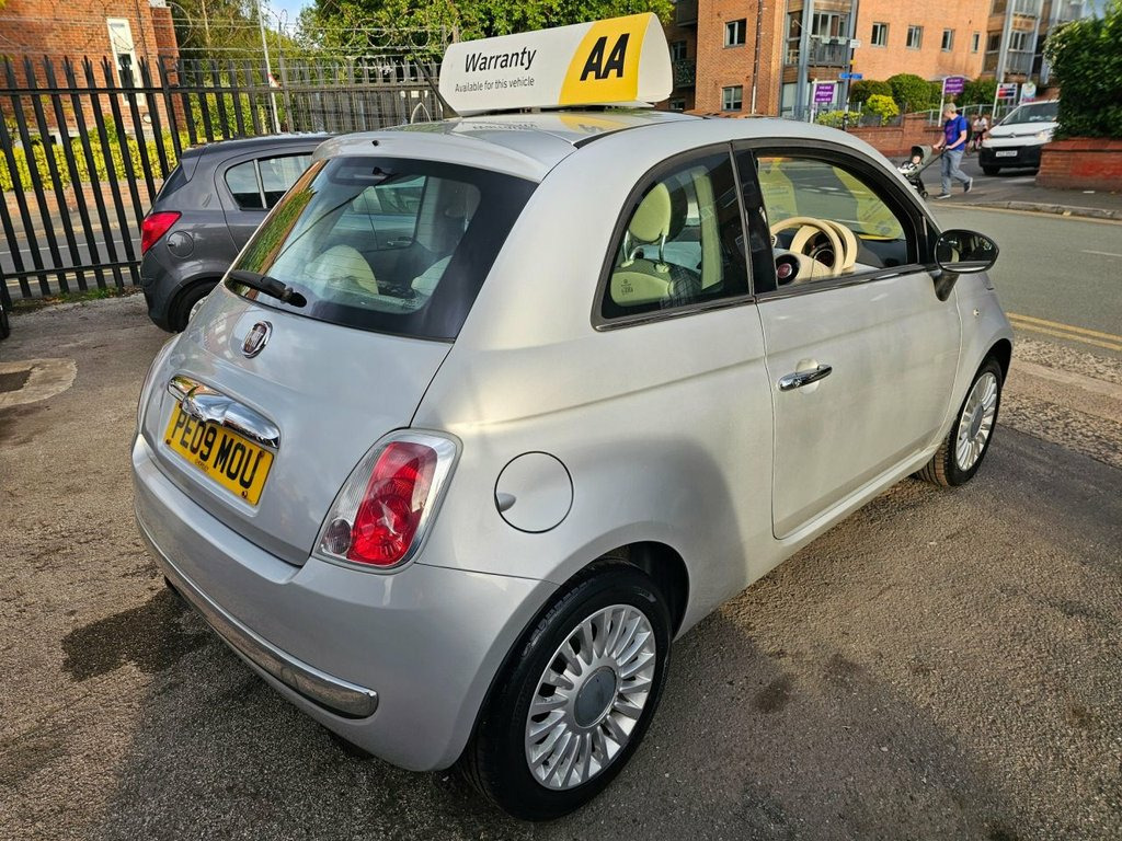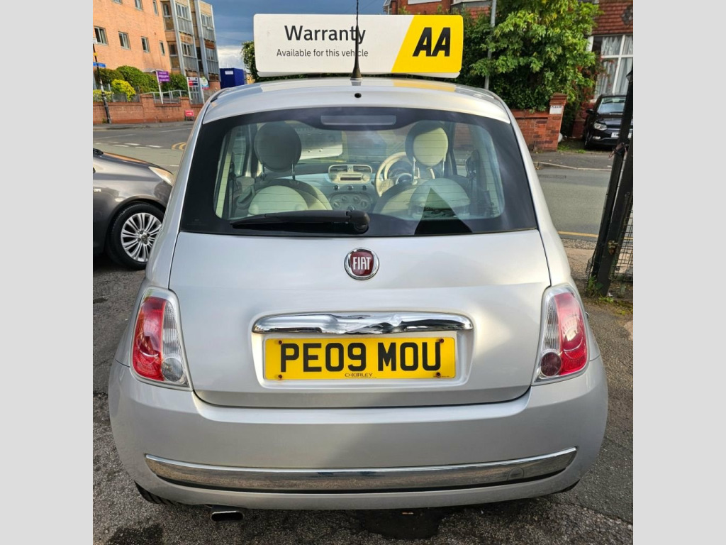 Here we have for sale a lovely 2009 fiat 500 lounge in the lovely metallic silver. It is the small 1.2L petrol engine which is great for new or first drivers as they are cheap to insure and very economical to run. It is only 2OWNERS from brand new and this is reflected in the condition of the car. It has covered very low mileage for its age of just over 36000 miles backed by a comprehensive service history consisting of 8 service stamps. It will come with a full 12month mot with no advisories and a full service from ourselves upon purchase. Very clean car both cosmetically and mechanically. First to see will buy. Here at chorlton car sales we strive to deliver 100% customer satisfaction to all our customers therefore we offer a full 3month aa warranty for complete piece of mind. Extended warranty is available by the reputable aa warranties for up to 12months as we are approved dealers for them. They are the uks number one warranty company. We are now proudly part of the aa dealer promise as aa approved dealers which means you can buy through us with complete confidence. Delivery available. 5day driveaway insurance available.12month aa breakdown cover with all vehicles. All major cards accepted. All forms of payment accepted. Open 7days a week. ESP, Auto Climate Control, Leather gear knob, 16in Lounge Alloy Wheels, Body colour side rubbing strips with 500, Electric SkyDome opening Sunroof, 16in Alloy Wheels, Chrome door mirror housings, 15in Two tone Sports Alloy Wheel, Sunroof, 16in Sport Alloy Wheels, Body colour side rubbing strips with spa, 15in Sports Alloy Wheels, 15in 18Spoke Alloy Wheels, 15in Alloy Wheels, Air Conditioning, Black ambience, Body colour door mirrors, Fixed Glass Sunroof with sunblind, Ivory ambience