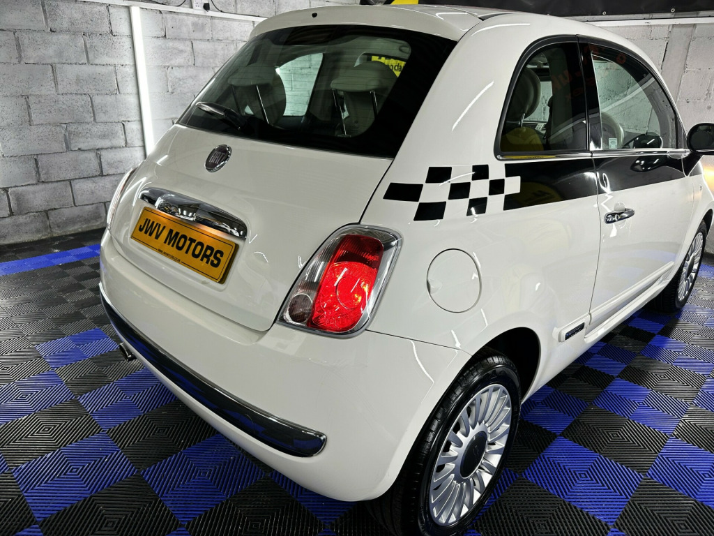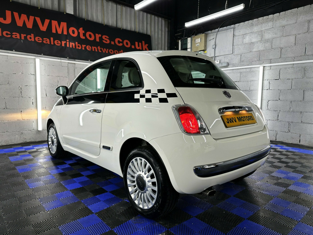 Here we have a lovely looking Fiat 500 Lounge with just 2 owners from new, which is in excellent condition inside and out for its age and good mileage. Excellent running costs, low insurance group and only £35 road tax. Service history comprising of 7 service stamps (some invoices) with a recent service and the cambelt just completed. This car comes complete with our best 3 months essential warranty, visit our website for full terms and conditions, for that extra peace of mind. HPI clear. Professionally valeted and detailed inside and out giving you the highest quality a car dealer can offer. The perfect new used car feeling. 1 x remote central locking key fob and 1 standard key. Part exchange welcome. This car is ready to drive away today. Appointments only giving you the customer our full attention, call today to arrange a viewing. All credit and debit cards accepted including American express. If you are looking for finance we work with a number of brokers to help find you the best deal. If you choose to finance your car with JWV Motors we will give you something back in return, up to months warranty with no admin fee. Unfortunately if you decide to choose an outsourced finance provider there will be an admin, this will vary depending on the company charges. If this car is not suitable for your needs you can visit all of our current stock on our website www.jwvmotors.co.uk. Why choose JWV Motors? Why not look at our reviews before making any decisions. Thank you for your time. SALE YOUR CAR THROUGH OUR SALE OR RETURN POLICY. INTERESTED PLEASE CALL FOR DETAILS. in alloy wheels - 431, body coloured bumpers, body coloured door mirrors, bumpers - chrome inserts, chrome exhaust tailpipe, chrome kit, chrome window contours, door handles - chrome, electric front windows, electrically adjustable heated door mirrors, fixed glass roof with sunblind, heated rear window, space saver spare wheel, abs - anti-lock braking system, airbags - driver, airbags - front side, airbags - passenger, drivers knee airbag, ebd - electronic brakeforce distribution, isofix child seat attachments, remote central locking, window airbags, air conditioning, head restraints - front height adjustment, height adjustable drivers seat, lounge interior trim, passenger seat with under seat compartment, pollen filter, seats - 50-50 split folding rear, seats - passengers back pocket, steering wheel - height adjustment, steering wheel - leather with audio controls, steering wheel audio controls, sunvisor - drivers with mirror, sunvisor - passenger with light and mirror, blue&me - hands free system with usb port, radio-cd and mp3 player, usb port, exterior temperature sensor, power steering - dualdrive electric, headlights - height adjustable