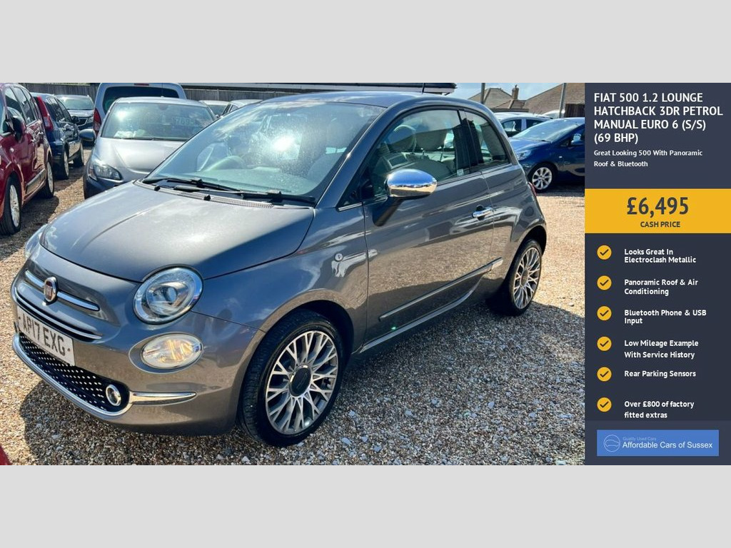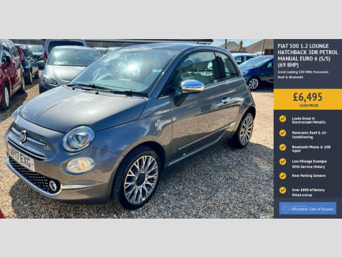 This 2017 Fiat 500 1.2 Lounge Hatchback 3dr Petrol Manual Euro 6 (s/s Hatchback is currently available for £6,495 in Peacehaven East Sussex with Petrol engine and Manual gearbox. For more information or to arrange a viewing, click here to send us an email using form below.