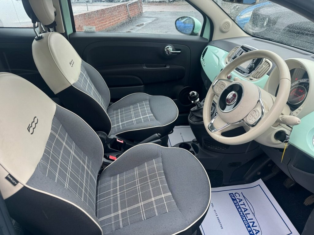Fiat 500 1.2 Lounge – Low Miles | £20 Tax | Excellent History Petrol | Manual | Euro 6 | 69 bhp | 58,942 Miles | MOT Until 29-09-2026 This Fiat 500 1.2 Lounge is a stylish and economical hatchback, perfect for city driving and beyond. With just 58,942 miles from new and only 2 owners, it's a low-mileage example that has been carefully maintained. It comes with excellent service history, boasting 6 recorded services, and benefits from cheap running costs with just £20 annual road tax. The reliable 1.2-litre petrol engine offers 69 bhp, providing an efficient yet enjoyable drive. Finished in an eye-catching green with a dark interior, this 500 Lounge combines character and practicality with its chic design, compact size, and great economy. A fantastic small car with great history, low costs, and plenty of charm. 2016 FIAT 500 1.2 Lounge Hatchback 3dr is offered to you for sale in Pudsey, Leeds, finished in green this FIAT 500 1.2 Lounge Hatchback 3dr is one of many handpicked used cars that used car dealer, Catalina of Stanningley, Pudsey, Leeds have available for sale. 12V Socket - Front, 15in Alloy Wheels, 50-50 Split Folding Rear Seat with Heigh, 5in Touchscreen Radio with AUX - USB - D, 7 Airbags, ABS with EBD, Air Conditioning, Automatic Door Locking, Body Coloured Bumpers, Chrome Kit, Chrome Plated Exterior Door Handles, Dualdrive Power Steering, ESC - Electronic Stability Control, Electric Front Windows, Electrically Adjustable Painted Door Mir, Fix and Go Puncture Repair Kit, Fixed Glass Roof with Sunblind, Fog Lights, Front Seats with Memory Function, Fuel Cap with Tap, GSI - Gear Shift Indicator, Hazard Light Automatic Activation During, Heat Reflective Windows, Heated Rear Window, Height Adjustable Drivers Seat, Height Adjustable Front Head Restr
