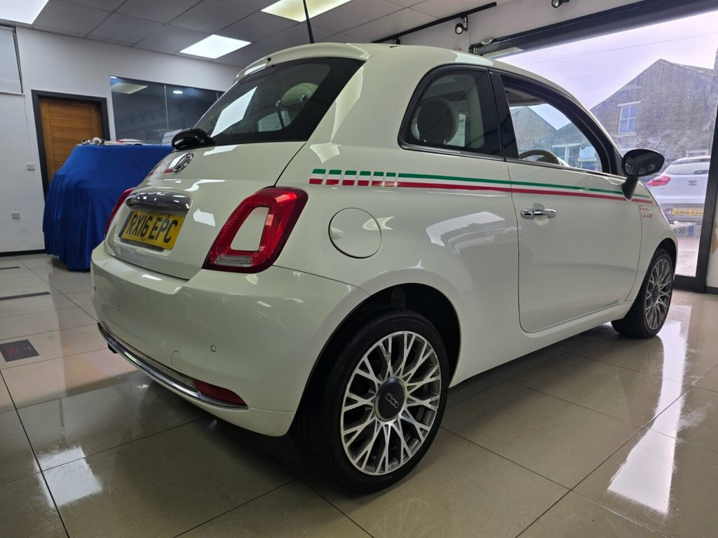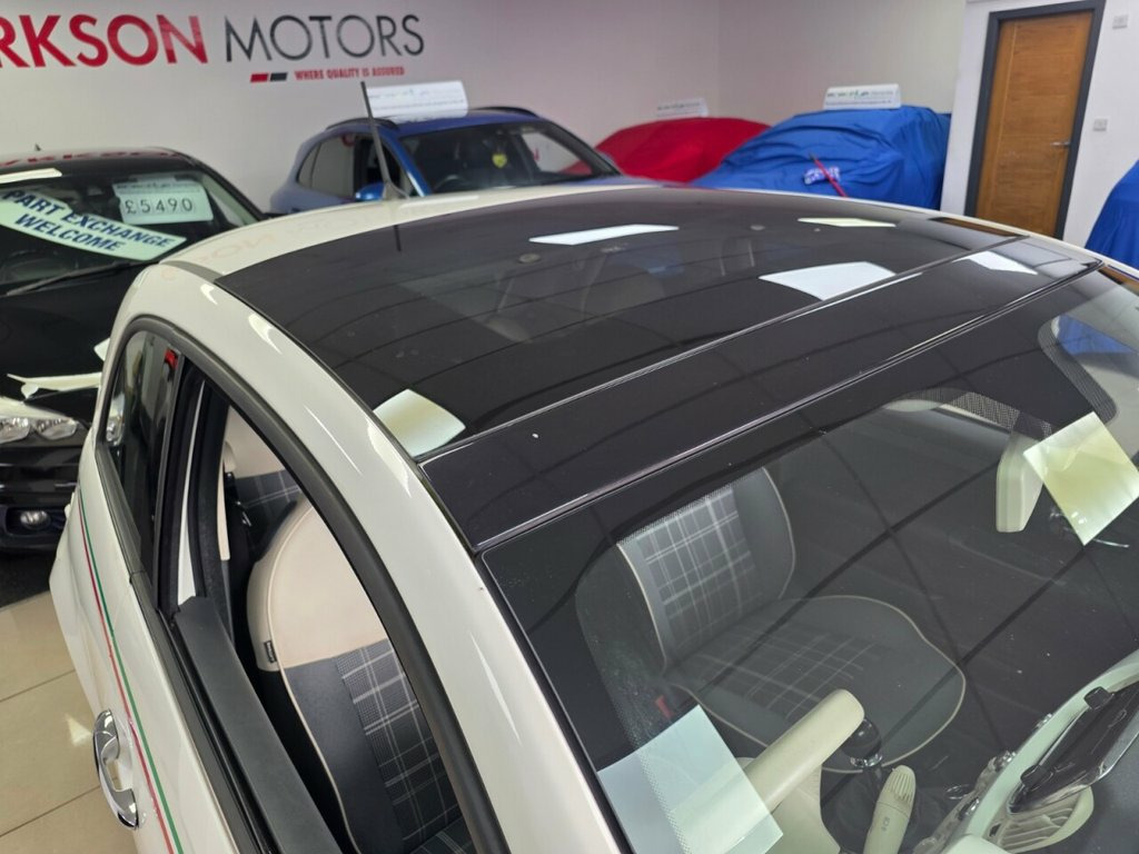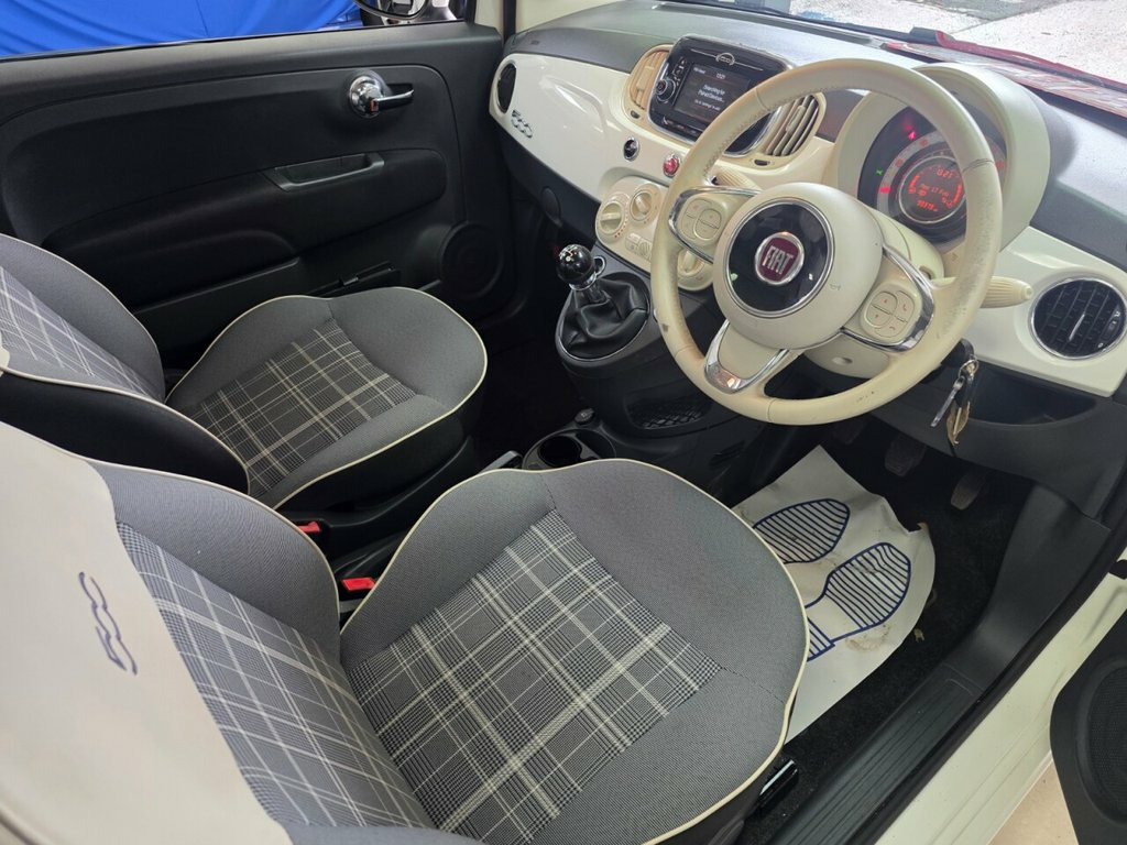 This 2016 Fiat 500 Lounge is a delightful example, having had only two owners from new. Free 12 month mot service history just been serviced upgraded alloys side tripe italian flag space saver wheel paan roof and much more It boasts a spirited 1.2 litre petrol engine, compliant with Euro 6 emissions standards, making it an economical choice. The Lounge trim level comes well equipped, featuring a fixed glass roof with a sunblind for an airy cabin feel, complemented by a stylish side stripe in the Italian flag design. You'll also find 16 inch alloy wheels, a 5 inch touchscreen radio with AUX, USB, DAB, and Bluetooth connectivity, and an electric sunroof, adding to its charm and practicality. This particular Fiat 500 stands out with its low insurance group rating, suggesting more affordable ownership. Furthermore, its low CO2 emissions indicate a more environmentally conscious performance compared to many other vehicles. These factors, combined with its desirable features and careful ownership history, present a compelling package for anyone seeking a chic and sensible compact car. Side Stripe - Italian Flag, Space Saver Spare Wheel, 16in Alloy Wheels - 5EQ, Electric Sunroof, LED Daytime Running Lights, Rear Parking Sensors, Dualdrive Power Steering, 12V Socket - Front, 15in Alloy Wheels, Steering Wheel - Leather with Audio Cont, 5in Touchscreen Radio with AUX - USB - D, 7 Airbags, ABS with EBD, Air Conditioning, Automatic Door Locking, Body Coloured Bumpers, Chrome Kit, Chrome Plated Exterior Door Handles, ESC - Electronic Stability Control, Electric Front Windows, Electrically Adjustable Painted Door Mir, Fix and Go Puncture Repair Kit, Fixed Glass Roof with Sunblind, Fog Lights, Front Seats with Memory Function, Fuel Cap with Tap, GSI - Gear Shift Indicator, Hazard