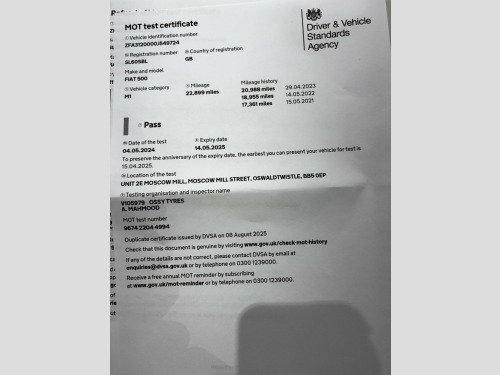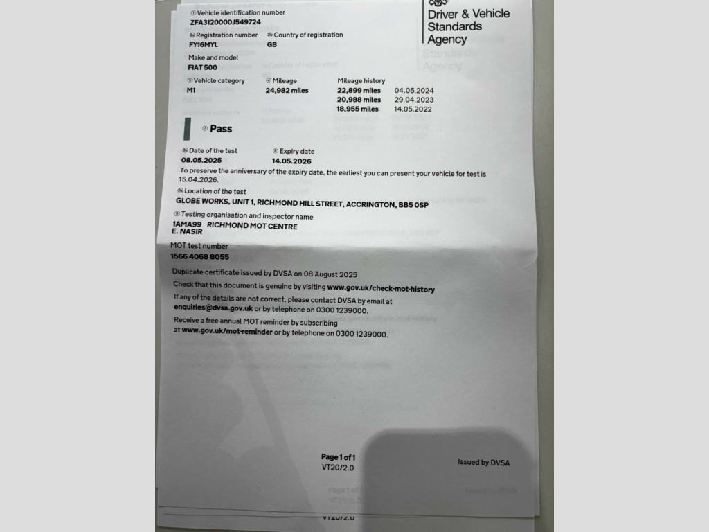With only 25115 miles on the clock, this 2016 Fiat 500 Pop offers an exceptional opportunity to own a nearly-new car. As a Fiat 500, this Pop trim model comes with a responsive 1.2L petrol engine and meets the Euro 6 emission standards. The vehicle also includes front seats with a memory function, adding a touch of luxury and convenience to your driving experience.This particular model stands out with its impressive fuel economy, achieving up to 60 mpg, meaning fewer trips to the petrol station and more money in your pocket. In addition, its low CO2 emissions contribute to reduced road tax and a smaller environmental footprint. The low insurance group rating makes it an ideal choice for new drivers or those seeking to minimise their running costs.. 12V Socket - Front, 14in Steel Wheels, 14in Wheel Covers, 7 Airbags, ABS with EBD, Automatic Door Locking, Body Coloured Bumpers, Chrome Plated Exterior Door Handles, Door Mirrors - Electric, Dualdrive Power Steering, ESC - Electronic Stability Control, Electric Front Windows, Electrically Adjustable Door Mirrors, Fix and Go Puncture Repair Kit, Front Seats with Memory Function, Fuel Cap with Tap, GSI - Gear Shift Indicator, Hazard Light Automatic Activation During Emergency Braking, Heat Reflective Windows, Heated Rear Window, Height Adjustable Front Head Restraints, ISOFIX Attachment Points for Child Safety Seat On Rear Seat, Instrument Panel with Rev Counter, LED Daytime Running Lights, Radio with USB and AUX, Rear Window Wiper-Washer, Remote Central Locking, Seats - Folding Rear Back, Steering Wheel - Height Adjustment, Steering Wheel Audio Controls, TPMS - Tyre Pressure Monitoring System, Trip Computer, Space Saver Spare Wheel, Cloth - Grey-Black-Light Grey with Black Ambience. Part service history