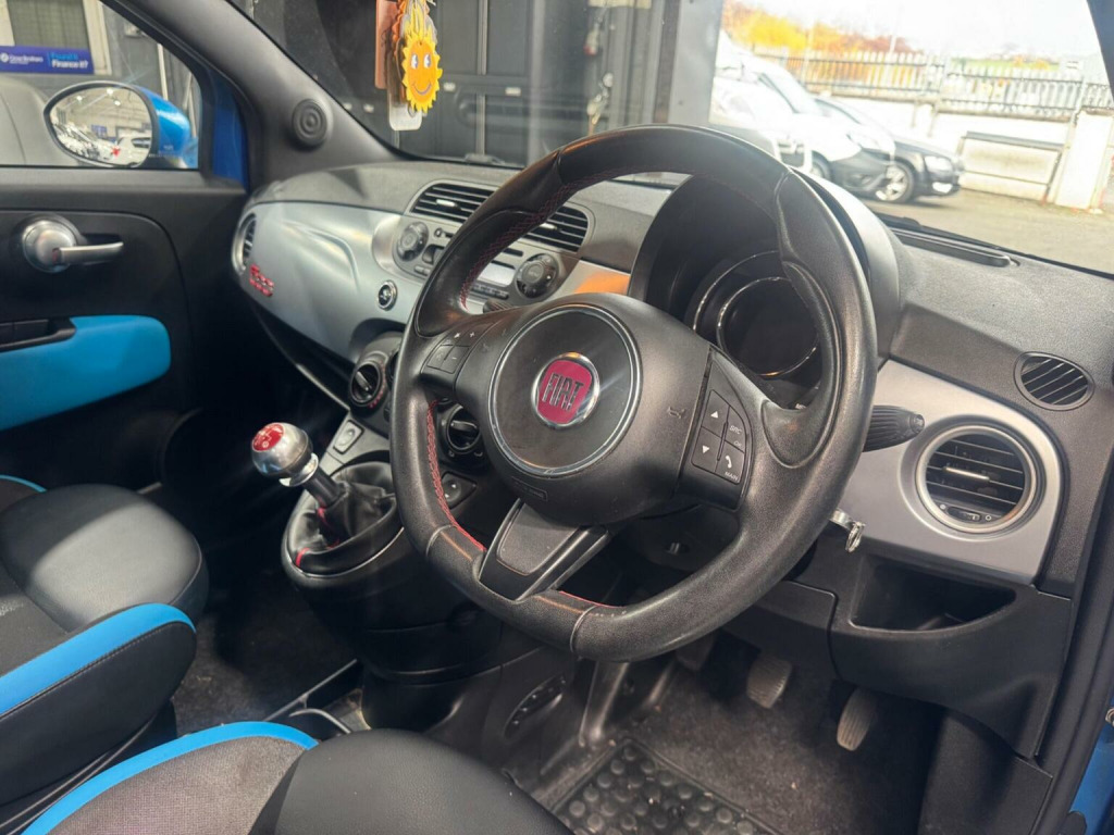 ALL MAJOR CREDIT AND DEBIT CARDS ACCEPTED,2014,BLUE WITH CONTRASTING BLACK PART LEATHER WITH FIAT 500 LOGO EMBOSSED ON SEATS, AIR CON,MULTI FUNCTION STEERING WHEEL,LONG MOT,ALLOY WHEELS,GREAT MPGS,LOW INSURANCE , PLEASE NOTE WE ARE LOCATED ON THE MAIN A73 2 MINS FROM THE M8A ND 5 MINS FORM THE M80!!!