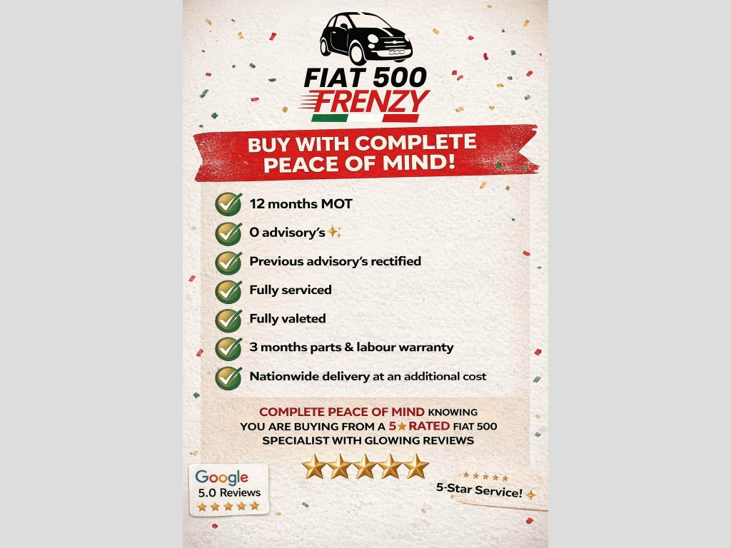 2017 Fiat 500 1.2 S Automatic (Facelift) – Electronica Blue – £20 Road Tax ** FACTORY APPLE CAR PLAY ** A rare opportunity to purchase this 2017 Fiat 500 1.2 S Automatic facelift, finished in the stunning and hard-to-find Electronica Blue. This is a superb example with a fantastic specification and smooth automatic gearbox, making it ideal for both city driving and longer journeys. The car comes very well equipped, including: Rear parking sensors Air conditioning Half leather sports trim Alloy wheels Privacy glass Apple CarPlay Powered by the reliable 1.2 petrol engine, this Fiat 500 is economical to run with only £20 per year road tax, while the automatic transmission offers relaxed and easy driving. A stylish, high-spec, automatic Fiat 500 in a rare colour – this one will not be around for long. Viewing is highly recommended. 12V Socket - Front, 15in Alloy Wheels - Satin Graphite, 50-50 Split Folding Rear Seat with Heigh, 7 Airbags, 7in HD Touchscreen Radio with Bluetooth , 7in TFT Instrument Cluster, ABS with EBD, Air Conditioning, Automatic Door Locking, Body Coloured Sports Bumpers, Dark Tinted Rear Windows, Door Mirrors - Satin Graphite, Dualdrive Power Steering, ESC - Electronic Stability Control, Electric Front Windows, Electrically Adjustable Painted Door Mir, Fix and Go Puncture Repair Kit, Fog Lights, Front Seats with Memory Function, Fuel Cap with Tap, GSI - Gear Shift Indicator, Hazard Light Automatic Activation During, Heat Reflective Windows, Heated Rear Window, Height Adjustable Drivers Seat, Height