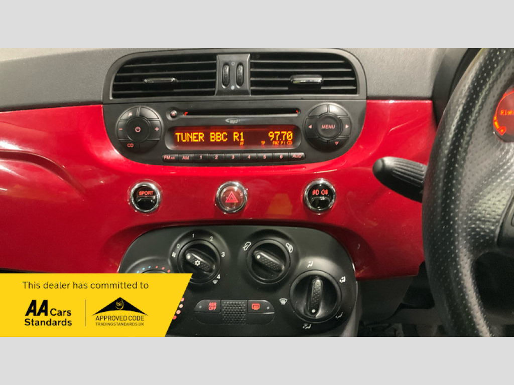 FIAT 500 1.4 SPORT Hatchback DVSA MILEAGE-4k (29/09/2011), 7k (01/10/2012), 9k (02/10/2013), 11k (11/09/2014), 12k (18/09/2015), 15k (30/09/2016), 17k (07/09/2017), 18k (05/09/2018), 19k (27/09/2019), 20k (11/09/2020), 20k (09/09/2021), 21k (05/09/2022), 21k (11/09/2023), 22k (10/09/2024), 28k (16/09/2025) Parking Sensor(s) Half Leather Trim Alloy Wheels. 15in Alloy Wheels, ABS, Air Conditioning, Brake Assist, Central Locking, Electric Windows, Front Airbags, Side Impact Airbags, Spare Wheel