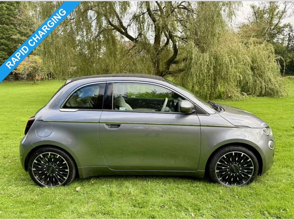 Fiat 500E La Prima Cabrio Convertible Electric 87 kW 42 kWh Top of the Range La Prima Model Amazing Saving Over New Price of Approximately £34,000 With Remainder of 8 Year Battery Warranty until March 2030 With Low 21,690 Miles Only 1 Owner With Full Service History – 2 Services Leather Interior Satellite Navigation La Prima Monogram Convertible Canvas Soft Top Reverse Camera Automatic Climate Control DAB Radio Adaptive Cruise Control Air Conditioning Bluetooth Telephone Wireless Phone Charger Parking Sensors Keyless Entry Automatic Wipers Automatic High / Low Beam 17″ Alloy Wheels Type 2 and CCS Charging with Rapid Charging Exceptionally Clean Condition Inside and Out Finance Available – Up to 5 Years Term HP Finance and 4 Years PCP Available Upon Request Nationwide Delivery Possible – Please Enquire As an RAC Approved Dealership All Vehicles Come with Fresh 12 Months MOT, a Complimentary 6 Months EV Electric Vehicle RAC Platinum Mechanical Warranty and 12 Month RAC Roadside Assistance. An Extended 12 Months RAC Mechanical Warranty is Available. You Can Buy with Confidence as Our Independent Family Business has Been Established over 40 Years, Spanning Three Generations. As a Result We Have Acquired a Wealth of Experience Which Means We Recognise Exceptional Cars.We Are Offered a Large Quantity of Vehicles on a Weekly Basis. However, We Only Select the Highest Quality Vehicles to Meet the Demands of Our Exacting Customers. All Vehicles Pu 10.25in Infotainment Touchscreen with Na, 12V Socket - Front, 17in Alloy Wheels, 6-Way Manually Adjustable Front Seats, 7in TFT Digital Instrument Cluster, ABS - Anti-Lock Braking System, Airbags - Driver, Airbags - Passenger, Attention Assist, Automatic Air Conditioning, Automatic High-Low Beam, Autonomous Emergency Braking - AEB, Bi-Colour Eco-Leather Steering Wheel wit, Central Console with Sliding Door Closin, Centre Console with Sliding Door Storage, Charging Cable - Mode 3, Chrome Exterior Accents, Cruise Control, DAB Radio, Dusk Sensor, E-Call - SOS, EV Mode Selector, Electric Windows - Driver and Passenger , Electrically Adjustable and Heated Body , Electrochromatic Rear View Mirror,