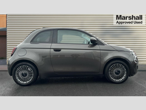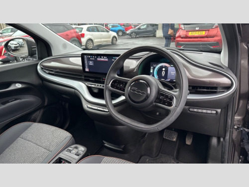 Fiat 500 87kW Icon 42kWh 2dr Auto 10.25" HD Touchscreen Radio with 3D Navigation, Bluetooth, USB, and DAB, 7" TFT instrument cluster, Apple car play/Android Auto, Attention assist, Cruise control, E-call, EV mode selector, Intelligent speed assist, Power assist steering, Traffic sign recognition, Uconnect live service, Vehicle Start Button, 85kW fast charge, Mode 3 charging cable with bag, Front USB port, Driver and passenger's one touch up/down electric windows, Dusk sensor, LED daytime running lights, LED rear lights, Rain sensing wipers, Welcome lighting, 50/50 split folding rear seat, Automatic air conditioning, Auxilliary 12V power socket, Centre console storage, Eco Leather steering wheel, Front headrests, Height adjustable steering wheel, Rear head restraints, Steering wheel with audio controls, 7 airbags - Driver, passenger, side, window and drivers knee airbags, ABS/EBD, Autonomous emergency braking, Brake assist function, Curtain airbags, Electronic parking brake, ESC + ASR/MSR + HBA + Hill holder, Automatic door locking, Keyless Start, Passive entry and wearable key, Remote central locking, Fix and go puncture repair kit