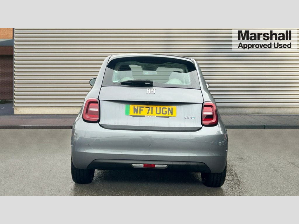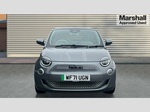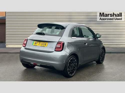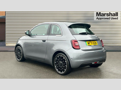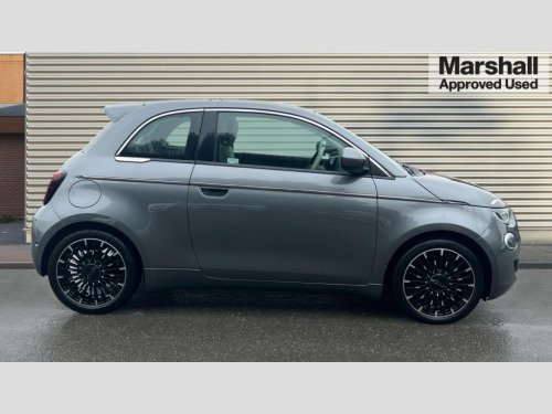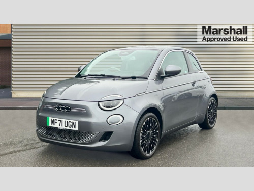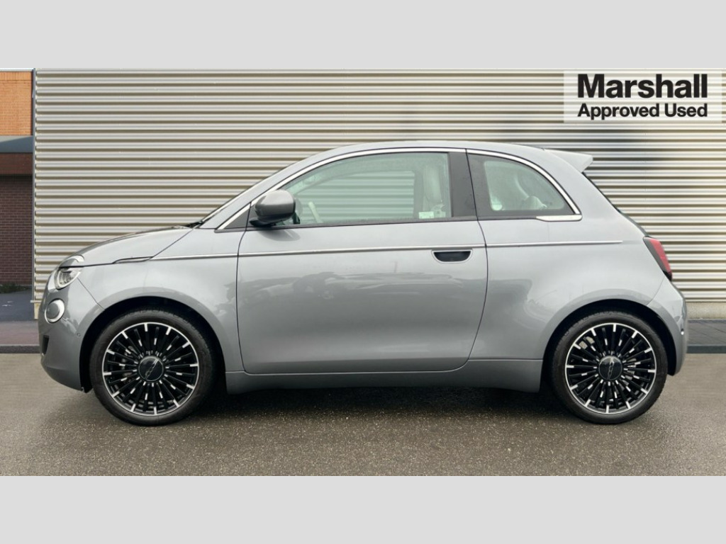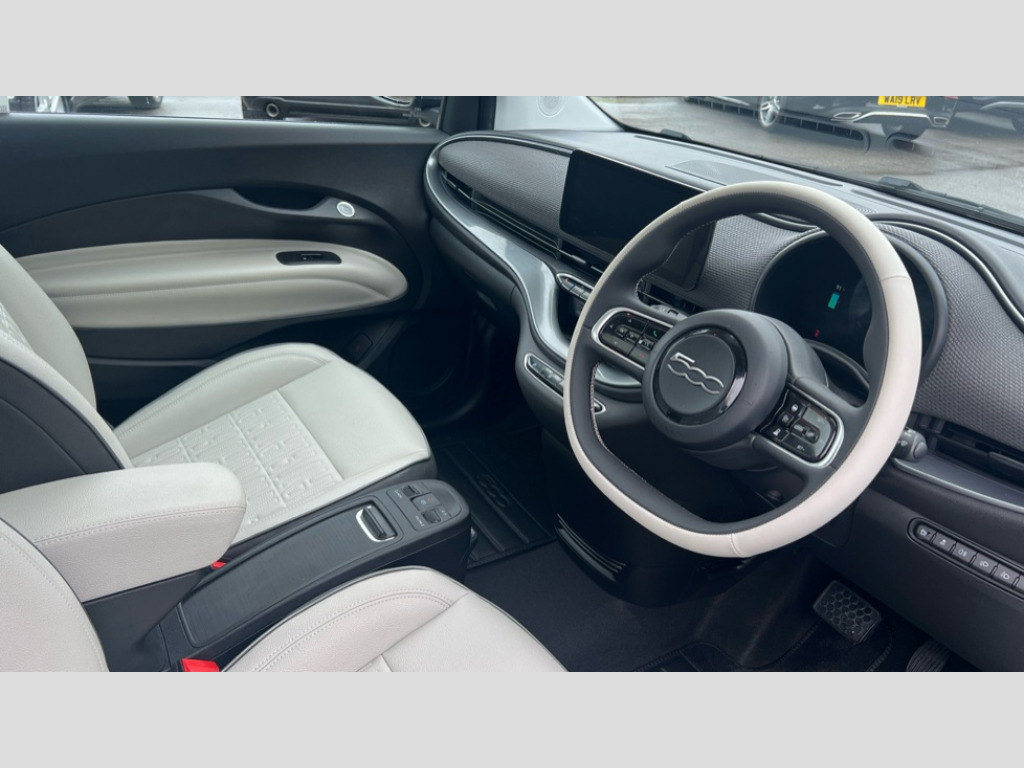 Fiat 500 87kW La Prima 42kWh 3dr Auto 10.25" touchscreen infotainment with navigation, 360 degree parking sensors, 7" TFT instrument cluster, Attention assist, Blind spot warning, Drowsy driver detection, E-call, EV mode selector, Fiat Co-Driver (Autonomous Driving L2 with iACC and lane centering), Front parking sensors, Intelligent speed assist, Power assist steering, Rear view parking camera, Traffic sign information, Traffic sign recognition, Uconnect live service, Vehicle Start Button, Voice recognition, Wireless apple car play/android Auto, Wireless charging pad, 85kW fast charge, Mode 3 charging cable with bag, 2x Front USB port, 6 speakers, DAB radio, Automatic high/low beam, Body colour electric adjustable heated door mirrors, Chrome side mouldings, Chromed daylight opening, Dedicated plate, Door sill kick plates, Driver and passenger's one touch up/down electric windows, Dusk sensor, Electrochromatic rear view mirror, LED daytime running lights, LED headlamps, LED Indicators, LED rear fog light, LED rear lights, LED reverse light, Rain sensing wipers, Welcome lighting, 50/50 split folding rear seat, 6 way manually adjustable front seats, Automatic air conditioning, Auxilliary 12V power socket, Bi-colour eco leather steering wheel, Cabin pre-conditioning, Centre console storage with sliding and closing door, Eco leather upholstery, Front armrest, Front headrests, Front/Rear floor mats with 500 logo, Height adjustable steering wheel, Rear head restraints, Steering wheel with audio controls, 7 airbags - Driver, passenger, side, window and drivers knee airbags, ABS/EBD, Autonomous emergency braking, Brake assist function, Curtain airbags, Electronic parking brake, ESC + ASR/MSR + HBA + Hill holder, Automatic door locking, Immobiliser, Keyless Start, Passive entry and wearable key, Remote central locking, 17" Alloy wheels, Fix and go puncture repair kit