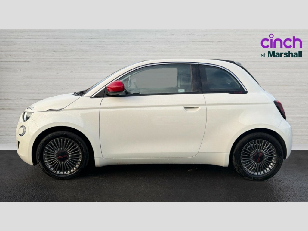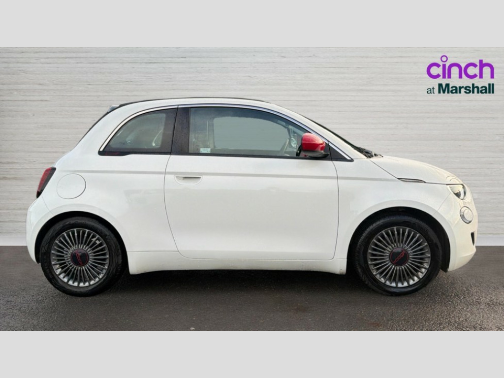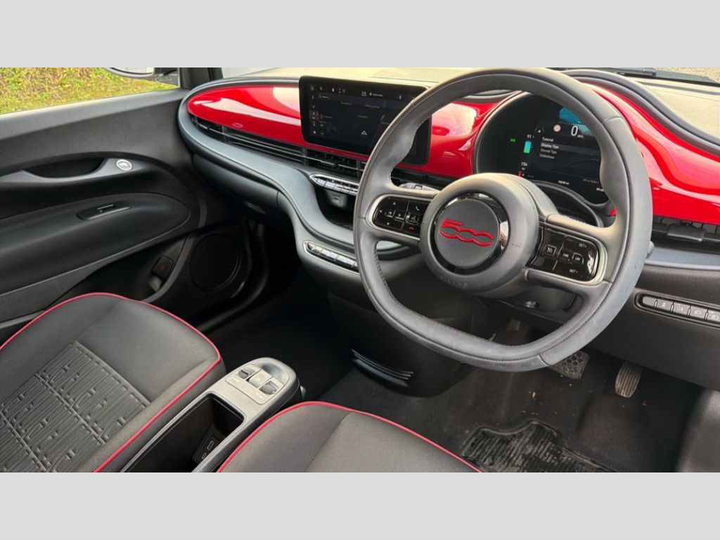 Fiat 500 87kW Red 42kWh 2dr Auto 10.25" touchscreen infotainment with navigation, 7" TFT instrument cluster, Attention assist, Bluetooth connectivity, Cruise control, E-call, EV mode selector, Intelligent speed assist, Lane keeping assistant (LKA), Power assist steering, Rear parking sensors, Traffic sign recognition, Uconnect live service, Vehicle Start Button, Wireless apple car play/android Auto, 85kW fast charge, Mode 3 charging cable, 2x Front USB port, 4 speakers, DAB radio, 3rd brake light, Chromed daylight opening, Dusk sensor, Electric adjustable door mirrors, LED daytime running lights, LED rear lights, Rain sensing wipers, Rear boot, Red logo on C-pillar, Unique exterior red finished door mirror covers, Unique exterior red finished front logo and moustache, Unique exterior red finished wheel centre hubcaps, Welcome lighting, 2 seat bench in second row, 4 way manually adjustable front seats, 50/50 split folding rear seat, Automatic air conditioning, Auxilliary 12V power socket, Centre console storage, Eco Leather steering wheel, Fabric upholstery with red dashboard, Front headrests, Height adjustable steering wheel, Rear head restraints, RED kit inclues cabin air filter, antibacterial treatment on surfaces and sanitiser dispenser, Red logo on steering wheel, Single front passenger seat, Specific floor mats with red logo, Steering wheel with audio controls, 7 airbags - Driver, passenger, side, window and drivers knee airbags, ABS/EBD, Autonomous emergency braking, Brake assist function, Curtain airbags, Electronic parking brake, ESC + ASR/MSR + HBA + Hill holder, Front passenger airbag deactivation, Tyre pressure sensor, Automatic door locking, Remote central locking, 16" alloy wheels, Fix and go puncture repair kit
