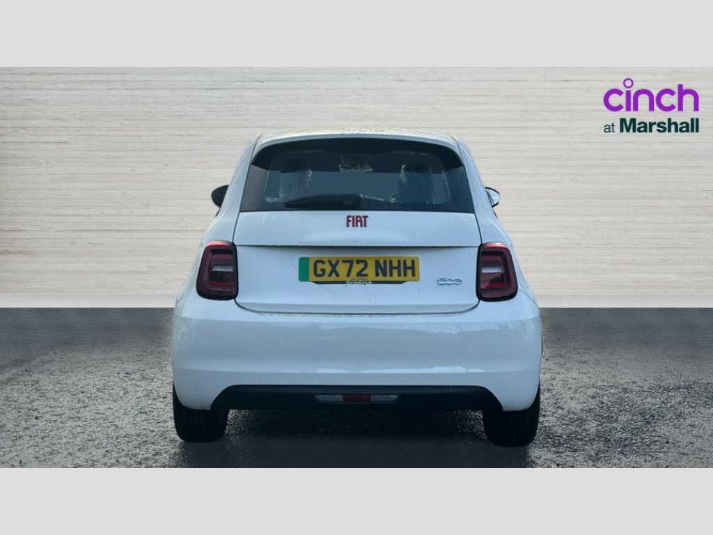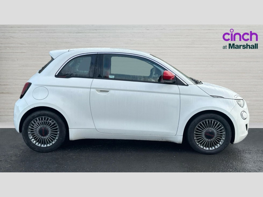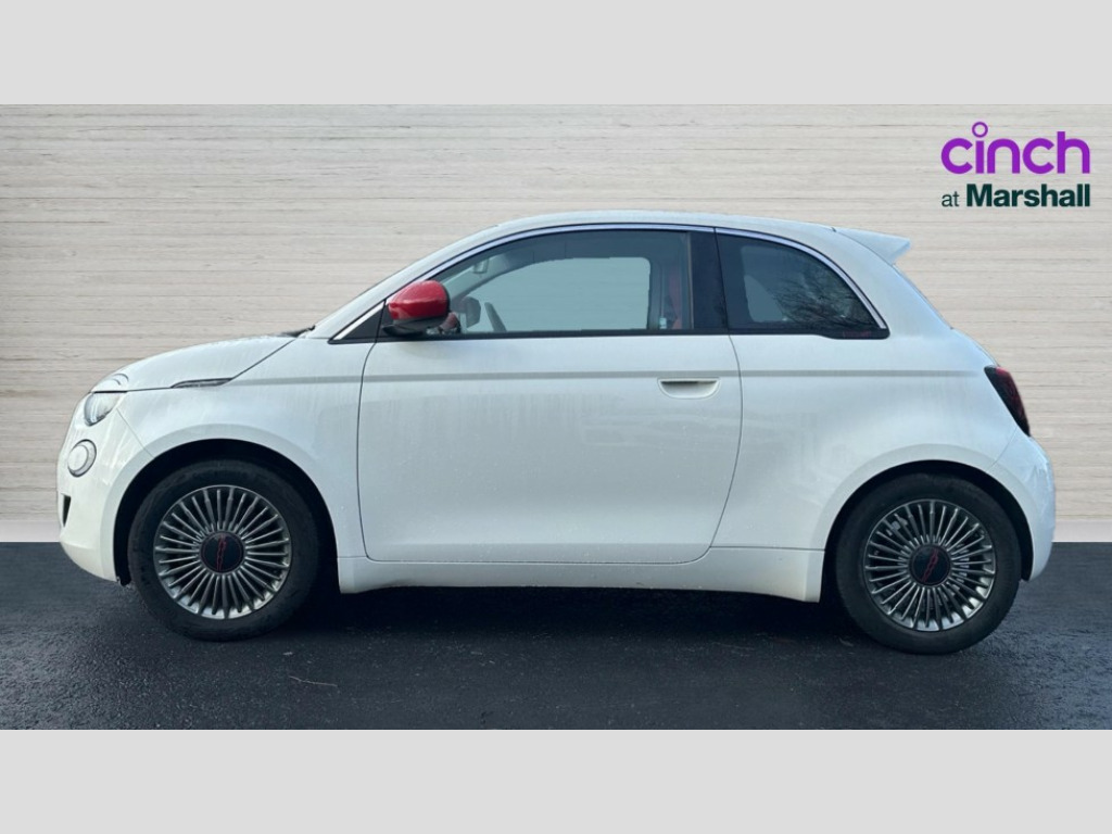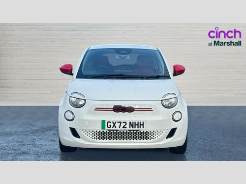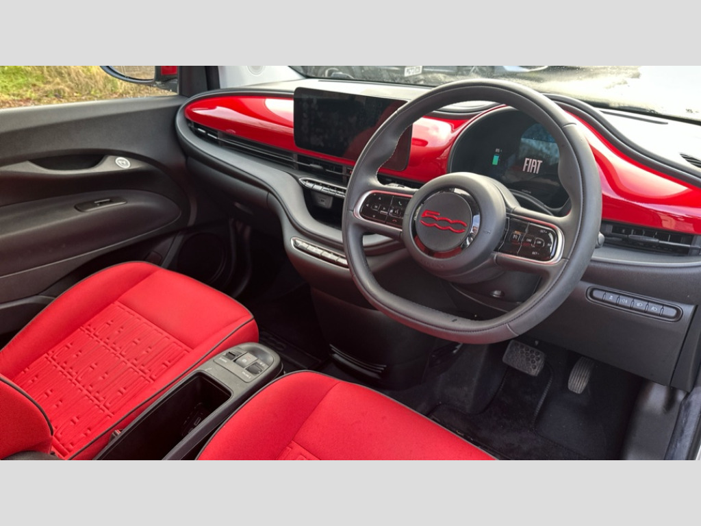 Fiat 500 87kW Red 42kWh 3dr Auto 10.25" touchscreen infotainment with navigation, 7" TFT instrument cluster, Attention assist, Bluetooth connectivity, Cruise control, E-call, EV mode selector, Intelligent speed assist, Lane keeping assistant (LKA), Power assist steering, Traffic sign recognition, Uconnect live service, Vehicle Start Button, Wireless apple car play/android Auto, 85kW fast charge, Mode 3 charging cable, 2x Front USB port, 4 speakers, DAB radio, 3rd brake light, Chromed daylight opening, Drivers one touch power window up/down, Dusk sensor, Electric adjustable door mirrors, Halogen headlamps, LED daytime running lights, LED rear lights, Rear wiper, Red logo on C-pillar, Unique exterior red finished door mirror covers, Unique exterior red finished front logo and moustache, Unique exterior red finished wheel centre hubcaps, Welcome lighting, 2 seat bench in second row, 4 way manually adjustable drivers seat, Automatic air conditioning, Auxilliary 12V power socket, Centre console storage, Eco Leather steering wheel, Fabric upholstery with red dashboard, Front headrests, Height adjustable steering wheel, Rear head restraints, RED kit inclues cabin air filter, antibacterial treatment on surfaces and sanitiser dispenser, Red logo on steering wheel, Single front passenger seat, Specific floor mats with red logo, Steering wheel with audio controls, 7 airbags - Driver, passenger, side, window and drivers knee airbags, ABS/EBD, Autonomous emergency braking, Brake assist function, Curtain airbags, Electronic parking brake, ESC + ASR/MSR + HBA + Hill holder, Front passenger airbag deactivation, Tyre pressure sensor, Automatic door locking, Keyless Go, Remote central locking, 16" alloy wheels, Fix and go puncture repair kit