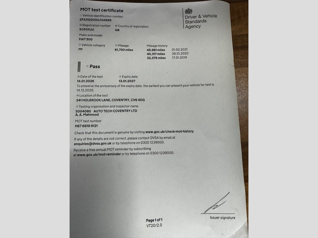 Service History, Last serviced at 61700, Next MOT: 12/01/2027, 3 Months Warranty, Spare Key, Road Tax: £35.00