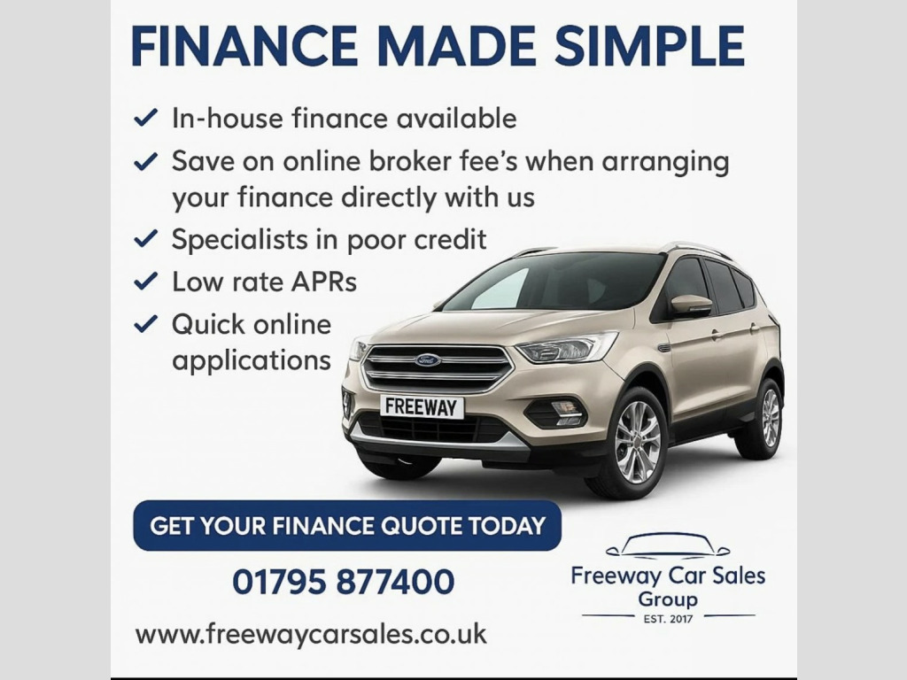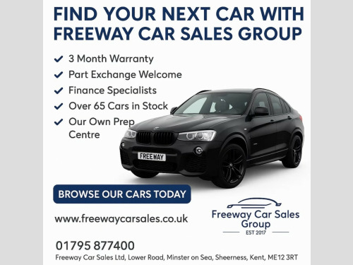 Sat Nav, Bluetooth, Half Leather, Parking Sensors, Cruise Control, Over 65 cars in stock. Poor credit? we can help, competitive finance packages arranged in house, low rates available, apply on our website for a no obligation quote. Upgrade to a 1 year gold warranty and an advisory free MOT for only £549 or spread the cost over 4 months for £137.25 a month with no credit checks or interest for complete piece of mind. Only 12 minutes from J5 M2, 18 mins J7 M20, 39 mins from Dartford Crossing. We have our own service centre that not only prepares your car before purchase but offers discounted servicing and repairs throughout your ownership.  Walk around videos available on request.  Cars come with a minimum 6 month MOT, service if due within the next 5,000 miles. Extended warranties, service plans and advisory free MOT guarantees also available. Please go to www.freewaycarsales.co.uk to view all our current stock. Arranging your own finance through a 3rd party company incurs a charge of £395.