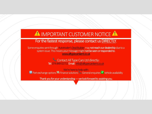 More than 30 cars in stock. Visit our website for more vehicles www.alltypecarskent.co.uk ULEZ Compliant--6 Months Nationwide Warranty Included--MOT Expires (November 2026)--Parking Sensors--Remote Central Locking--Heated Front Seats--Bluetooth--Satellite Navigation System-Power Socket --AUX Phone Connection--DAB Radio --Engine Immobiliser--2 Keys--Alloy Wheels--Warranted miles--HPI clear---6 Months Breakdown Cover--Dealer Warranty - '' 7 Days Exchange Guarantee'' and '' 90 & 180 Days Free Check Up'', Exchange Welcome, UK Wide Delivery Available (fees apply), A non-refundable administration fee of £200 is included in the total purchase price. Major debit/credit accepted and £0 Deposit, Low credit score Finance options are available. Please visit our website www.alltypecarskent.co.uk for more vehicle or finance options or simply call us on 07484 902711 during our opening hours Mon-Sat 9.30 am - 5 pm. * ld weather pack, visibility pack, cloth - black with grey piping, heated front seats, nav pack, 12v point, 17in alloy wheels, 3.5in tft monochrome screen, 5in touchscreen dab radio with navigation - bluetooth - usb - aux-in, 6 airbags, 60-40 split folding rear seats, automatic climate control, body coloured bumpers, body coloured dashboard, body coloured door mirrors, cooled glovebox, cruise control with speed limiter, dab radio, deadlocks, drive mood selector, dualdrive power steering, erm - electronic rollover mitigation, esc - electronic stability control including asr-msr - hill holder - abs - ebd - erm - dst and bas, electric adjustable wing mirror with defrosting function, electric windows - front and rear, electronic parking brake, fix and go puncture repair kit, front fog lights with cornering function, height adjustable drivers seat, height adjustable seatbelts, leather steering wheel, passengers airbag deactivation, rear parking sensors, rear spoiler, remote control central door locking, seats-back pockets, speakers x6, steering wheel audio controls, tyre pressure monitor system, uconnect live
